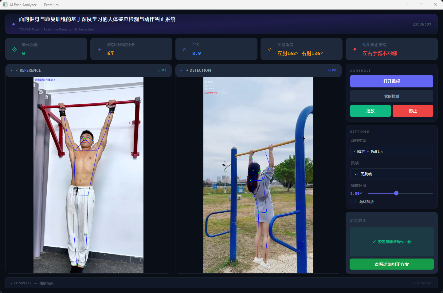 支持视频文件和摄像头实时检测,提供双视频同步对比、姿态相似度评分、关键角度显示、动作计数、智能纠正反馈及详细纠正方案查询功能。