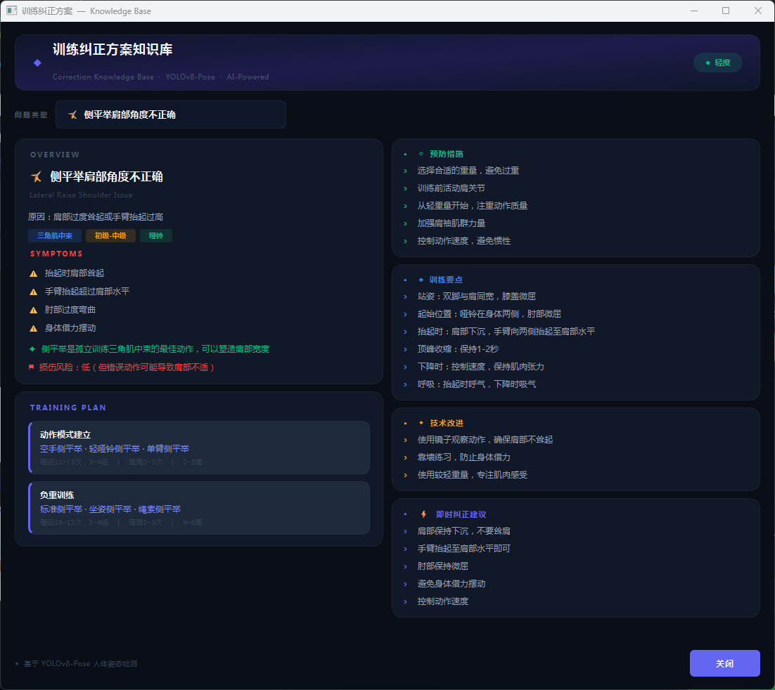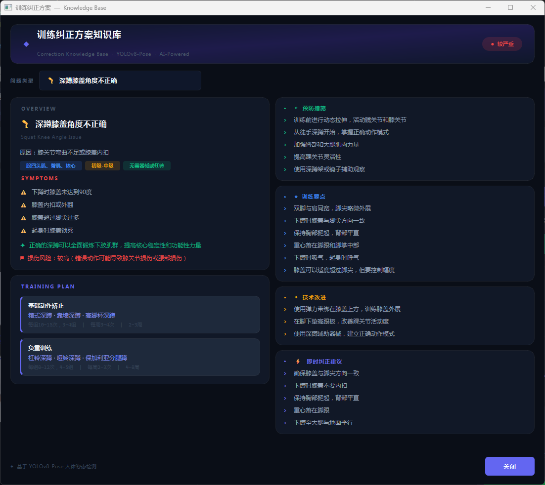 本系统内置专业纠正知识库,涵盖5种常见健身动作错误类型。用户点击”查看详细纠正方案”按钮,系统启动独立知识库窗口,以卡片式布局展示各类错误的详细信息。每个方案包含错误原因分析、典型症状描述、预防措施建议和具体纠正动作指导四个模块。知识库涵盖俯卧撑肘部角度不正确、深蹲膝盖角度问题、引体向上肩部姿态错误、侧平举肩部控制不当及通用身体姿态问题五大类别,每类标注严重程度并提供3-5条具体纠正建议和训练技巧,为用户提供系统化、专业化的动作纠正指导