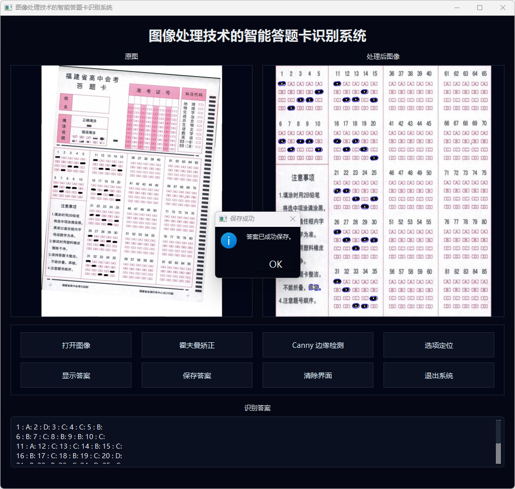 本系统通过图像处理技术实现智能答题卡的自动化答案识别,采用模块化设计,包括图像预处理、霍夫曼矫正、Canny边缘检测、选项定位和答案识别等功能。用户上传答题卡图像后,系统进行霍夫曼矫正、Canny边缘检测及透视变换,确保图像正向显示并标准化。通过连通域分析和阈值分割定位填涂区域,识别并提取答案。最终,识别结果以文本形式显示,用户可保存或清除答案。系统设计注重操作简便性和高效性,为教育评估提供精准、快速的自动解题工具。