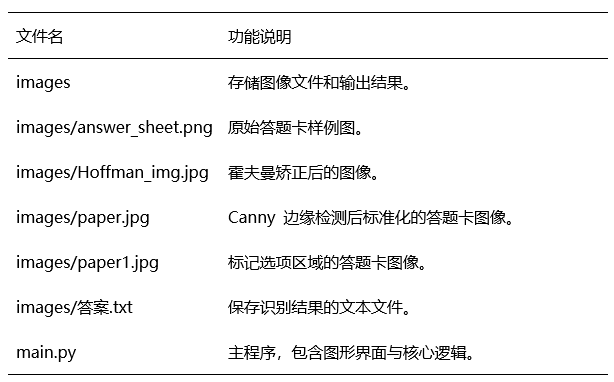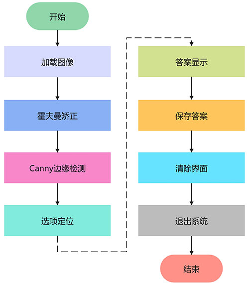 该系统的主要技术包括霍夫曼变换、Canny边缘检测、透视变换以及连通域分析等。首先,系统使用霍夫曼变换对原始答题卡图像进行旋转矫正,确保图像正向排列。接着,采用Canny边缘检测算法提取图像中的边缘信息,并通过透视变换将图像校正为标准化的答题卡格式。然后,利用阈值分割与连通域分析方法定位答题卡中的选项区域,最后通过几何信息识别每个选项的答案。