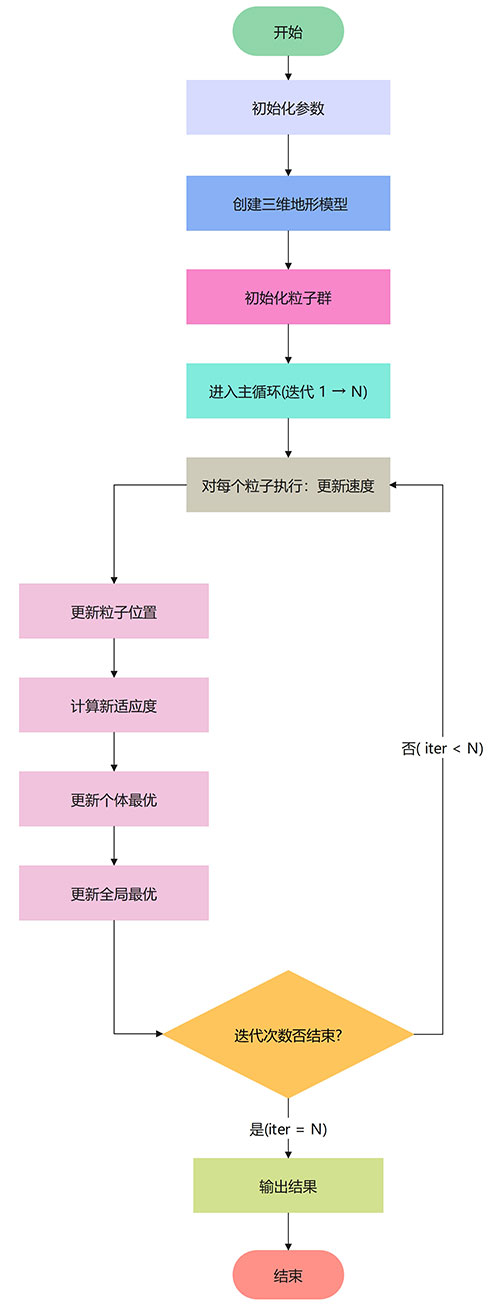 在算法设计上,首先通过粒子群优化算法对路径进行优化,粒子的位置代表路径中的关键点。引入双目标函数-路径长度和路径平滑度,确保路径既最短又平滑。同时,结合地形数据设计了碰撞检测约束,确保路径不会与障碍物相交。为提升搜索效率,采用自适应惯性权重策略,增强了全局和局部搜索的平衡。
