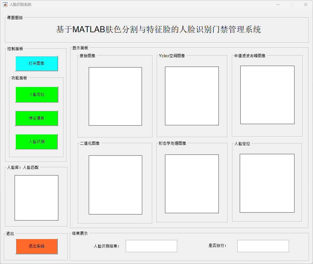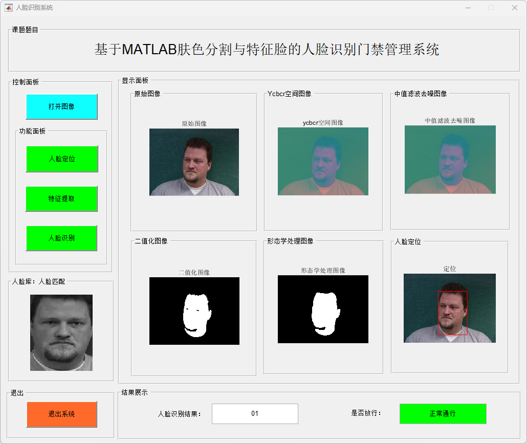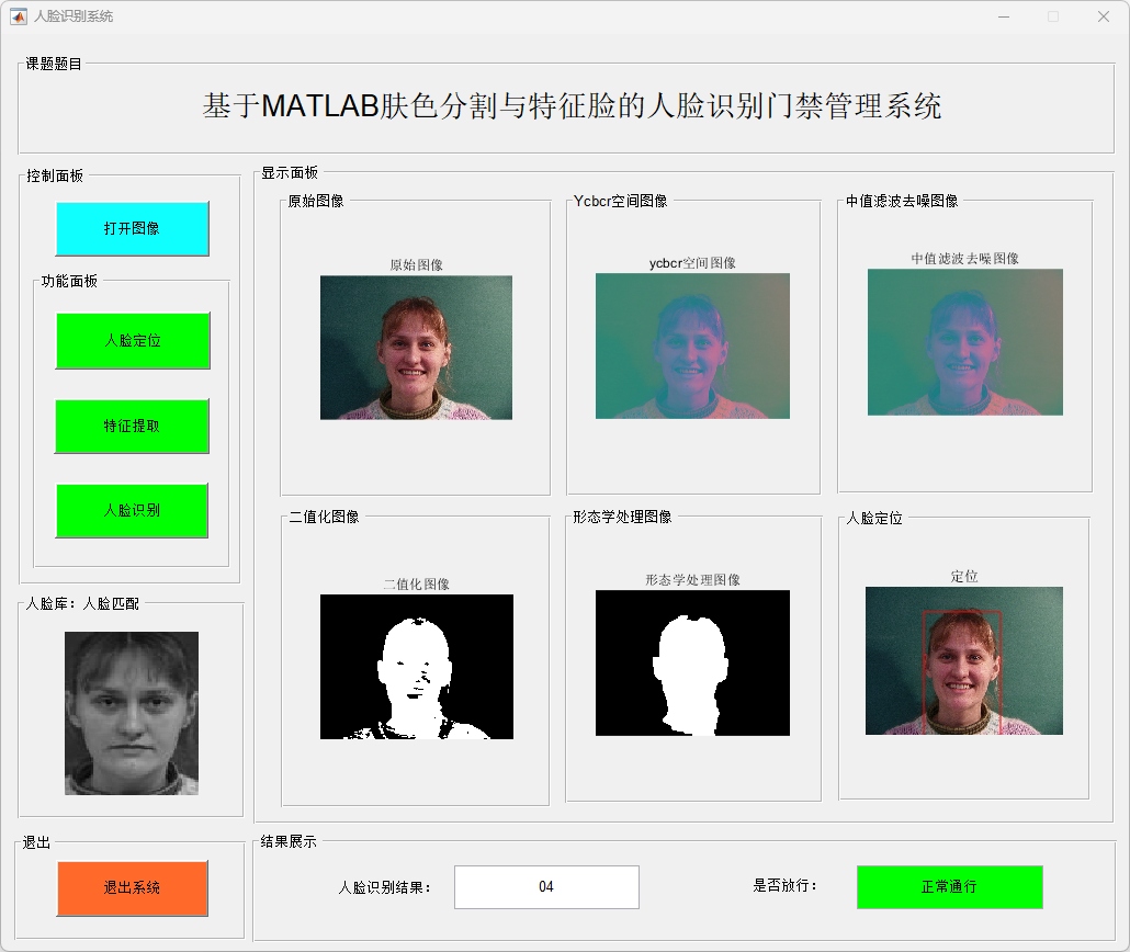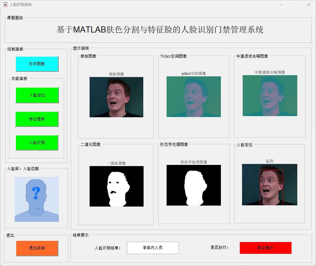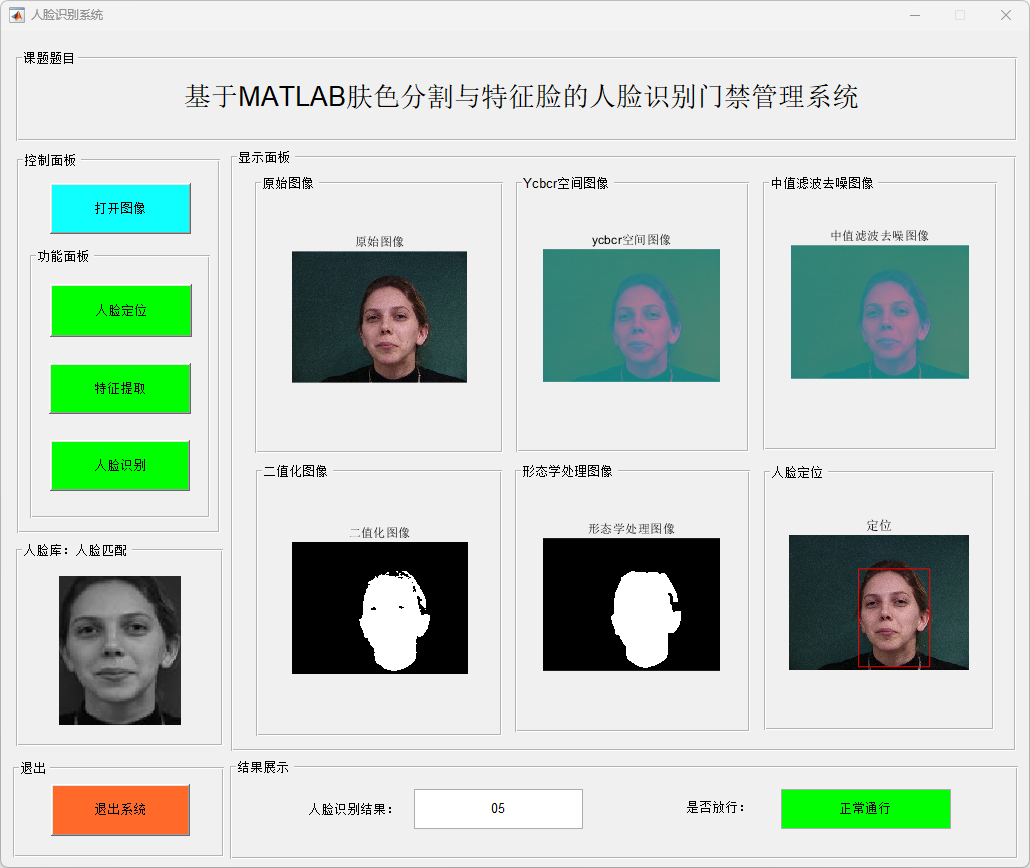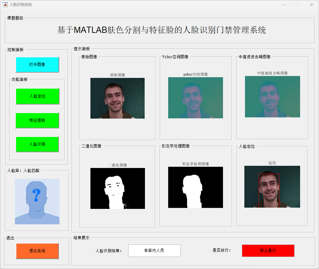 针对传统门禁方式安全性与便捷性不足的问题,本文设计并实现了一种基于肤色分割与特征脸的人脸识别门禁管理系统。系统首先将输入人脸图像转换至 YCbCr 颜色空间,利用肤色统计模型对人脸区域进行分割,并结合中值滤波和形态学处理方法实现人脸区域的准确定位与裁剪;随后采用主成分分析(Principal Component Analysis,PCA)方法对人脸图像进行特征提取,构建特征脸空间,并基于最小距离判别实现人脸身份识别。