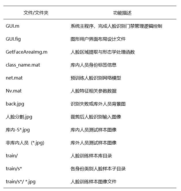 在此基础上,系统根据识别结果完成门禁管理中的通行控制,实现对库内人员的有效识别以及对库外人员的拒识处理。系统基于 MATLAB 平台完成设计与实现,并通过实验对其性能进行了验证。实验结果表明,该系统在库内人员识别与库外人员拒识方面具有较好的有效性和稳定性,能够满足小规模人脸识别门禁管理系统的应用需求。