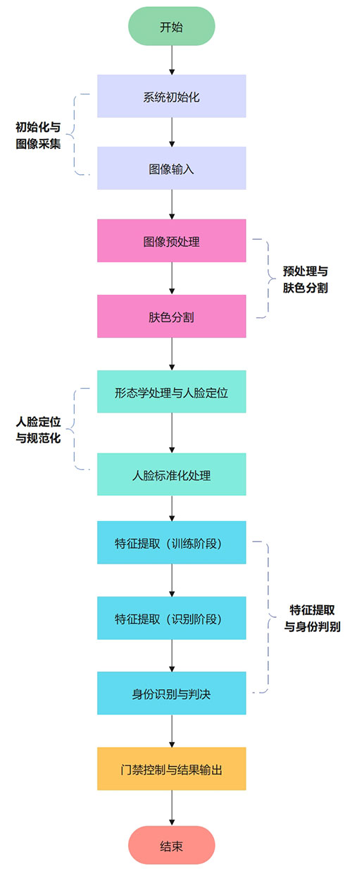 本系统采用模块化设计思想,整体由系统初始化与图像采集、图像预处理与肤色分割、人脸定位与规范化处理、人脸特征提取与身份判别以及门禁控制与结果输出等功能模块组成,实现了人脸识别门禁管理的完整流程。