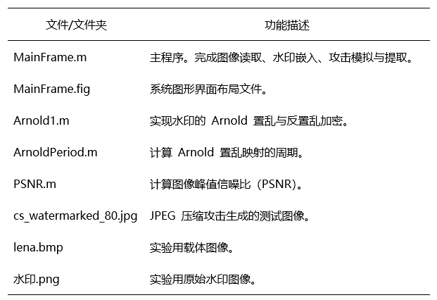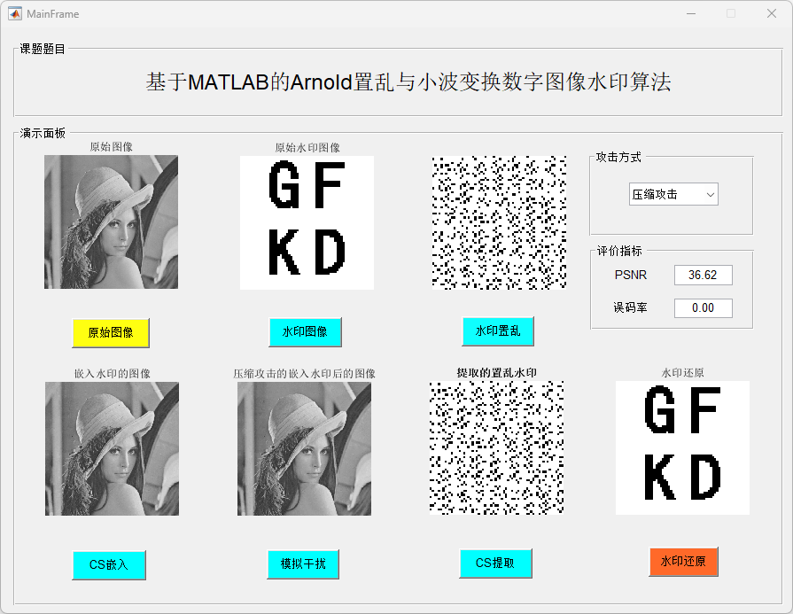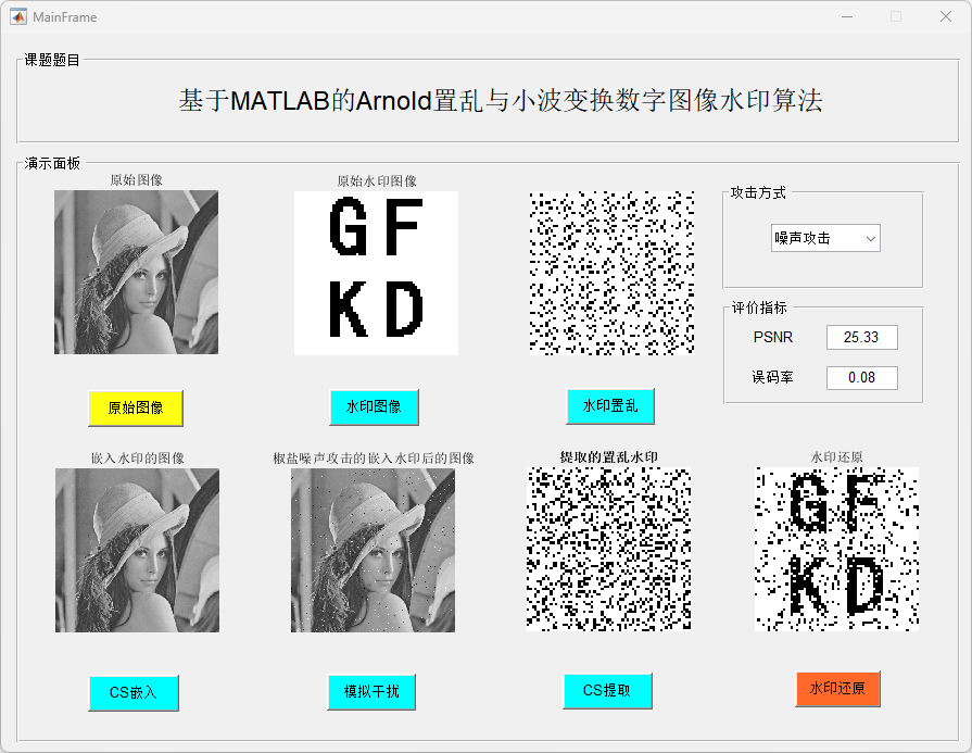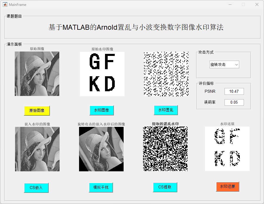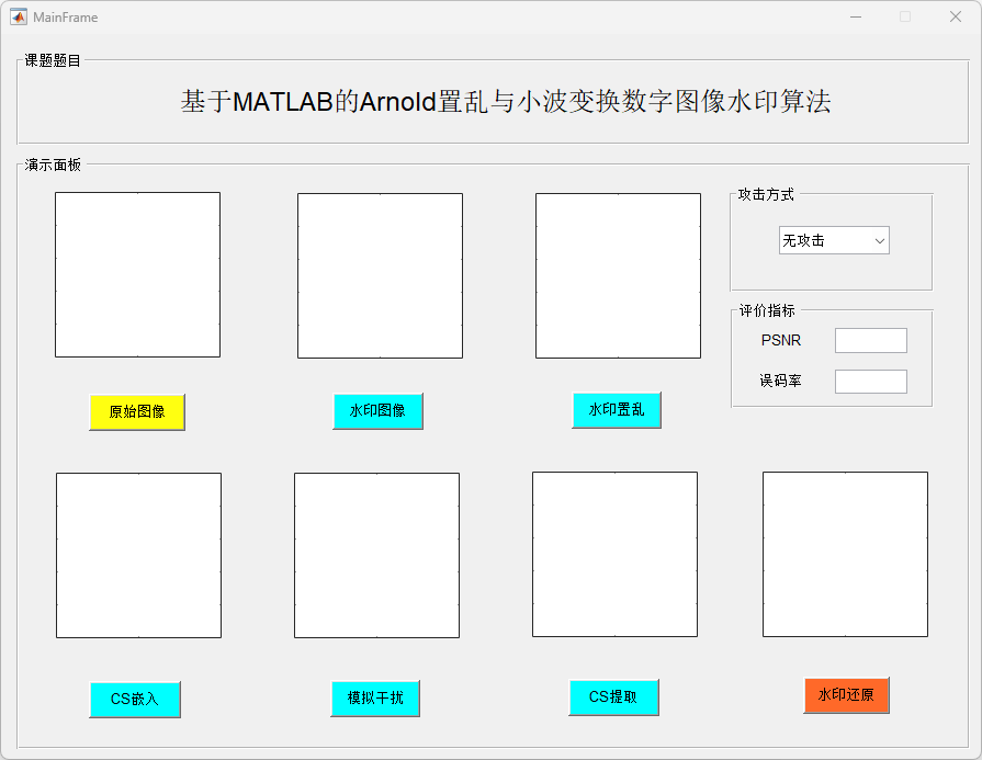 该界面集成了图像读取、水印置乱、嵌入、攻击模拟、水印提取及性能评价等功能,实现了数字水印算法的可视化与交互式验证。