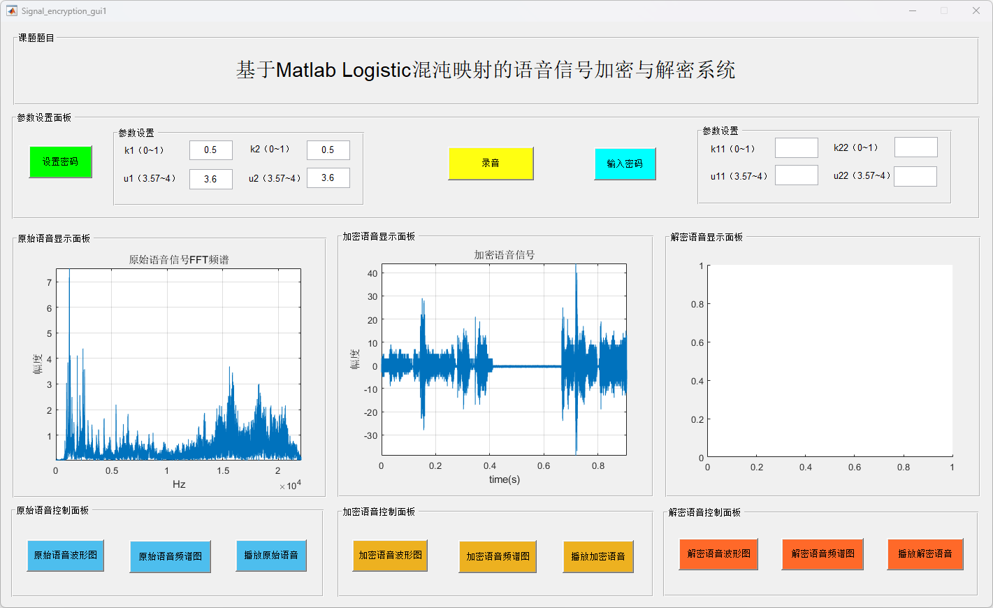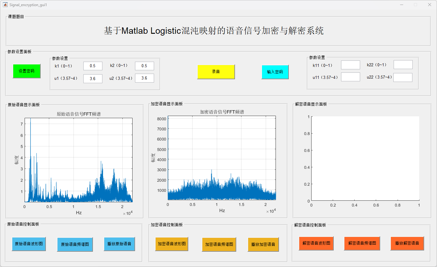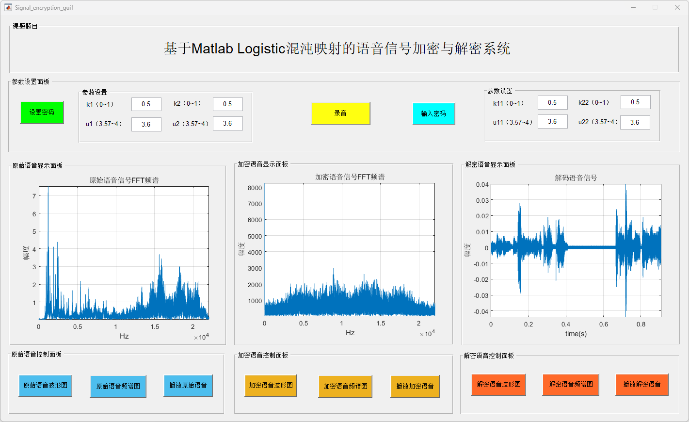 此外,系统还具备语音信号频谱分析和实时播放功能,便于用户对加密及解密信号进行质量评估。用户可根据需求自定义加密参数(如Logistic映射的初值和控制参数),从而增强加密的灵活性与安全性。实验结果验证了该系统在多种加密参数设置下的稳定性与可靠性,进一步证实其在实际应用中的可行性。