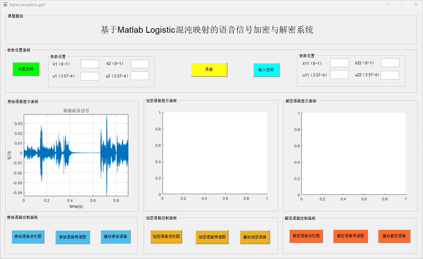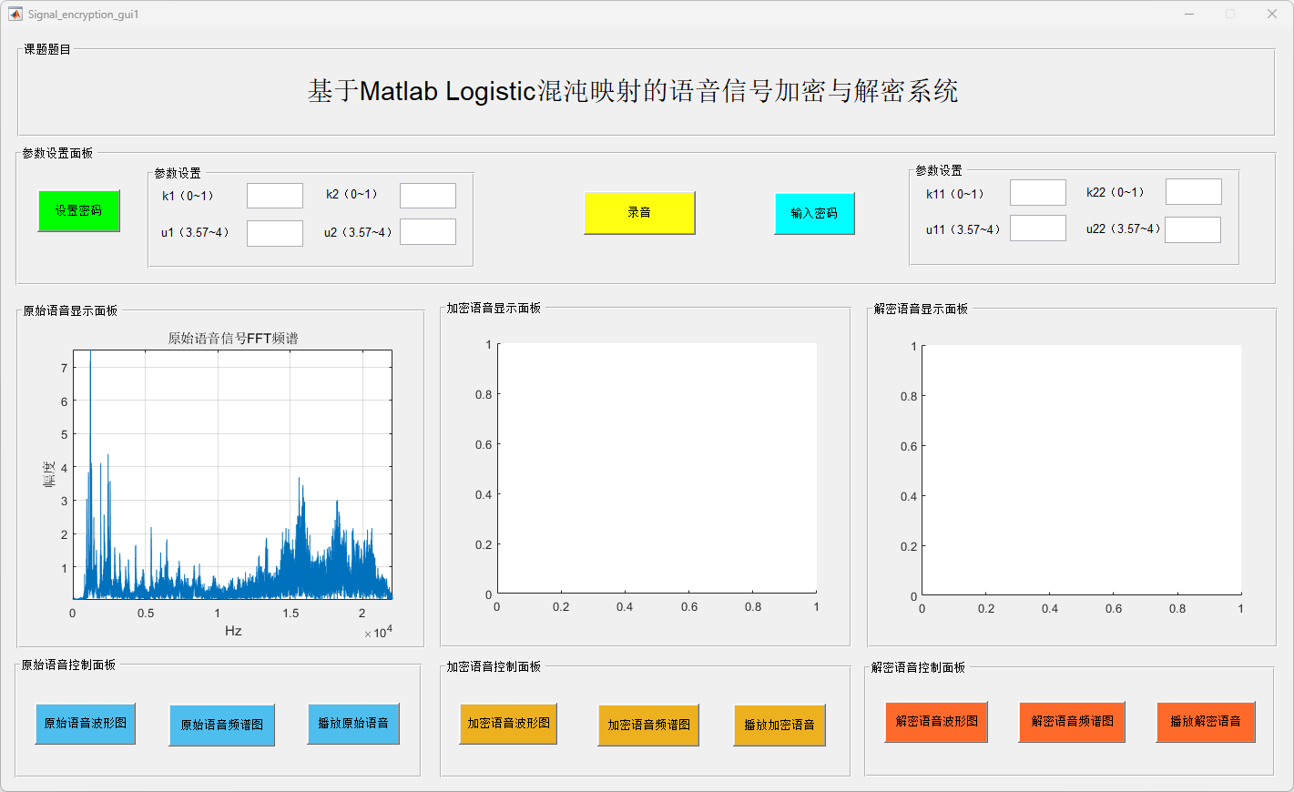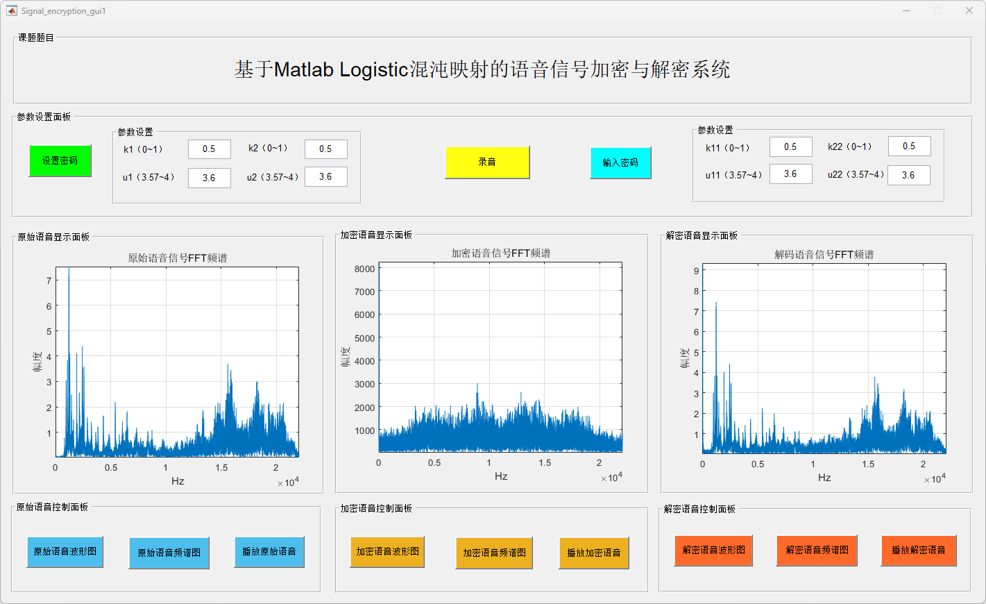 此外,系统还具备语音信号频谱分析和实时播放功能,便于用户对加密及解密信号进行质量评估。用户可根据需求自定义加密参数(如Logistic映射的初值和控制参数),从而增强加密的灵活性与安全性。实验结果验证了该系统在多种加密参数设置下的稳定性与可靠性,进一步证实其在实际应用中的可行性。