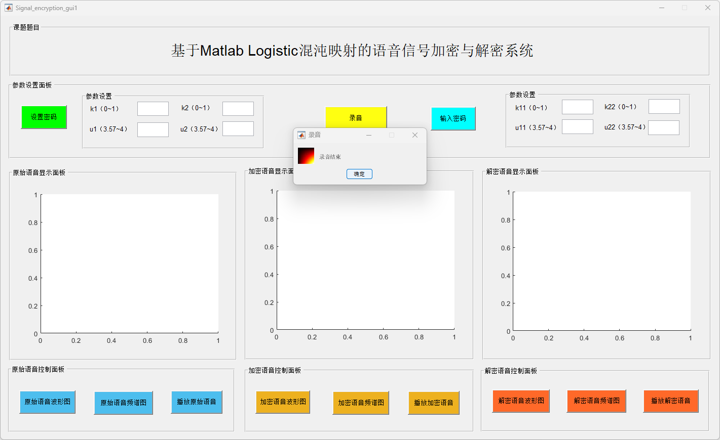 为了保护语音信号在网络通信中的传输安全,避免敏感语音信息被非法窃取或篡改,本文设计并实现了一种基于Logistic混沌映射的语音信号加密与解密系统。该系统采用MATLAB作为开发平台,并结合GUI(图形用户界面)技术,为用户提供了友好的交互界面,支持语音信号的录制、加密、解密以及信号的时域和频域可视化分析功能。通过混沌理论中的Logistic映射生成加密序列,系统实现了高效且复杂的语音加密过程。