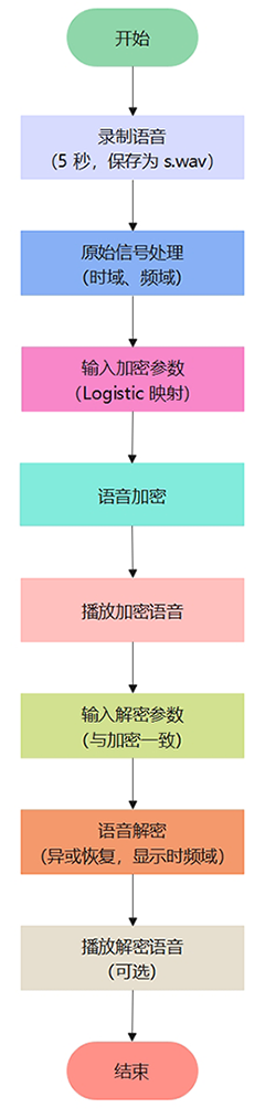 本系统通过录制语音并利用 Logistic 混沌映射生成的伪随机序列对语音信号进行加密与解密,实现语音信号在时域和频域下的安全处理与播放。