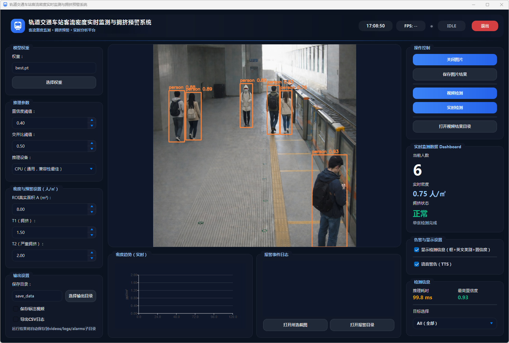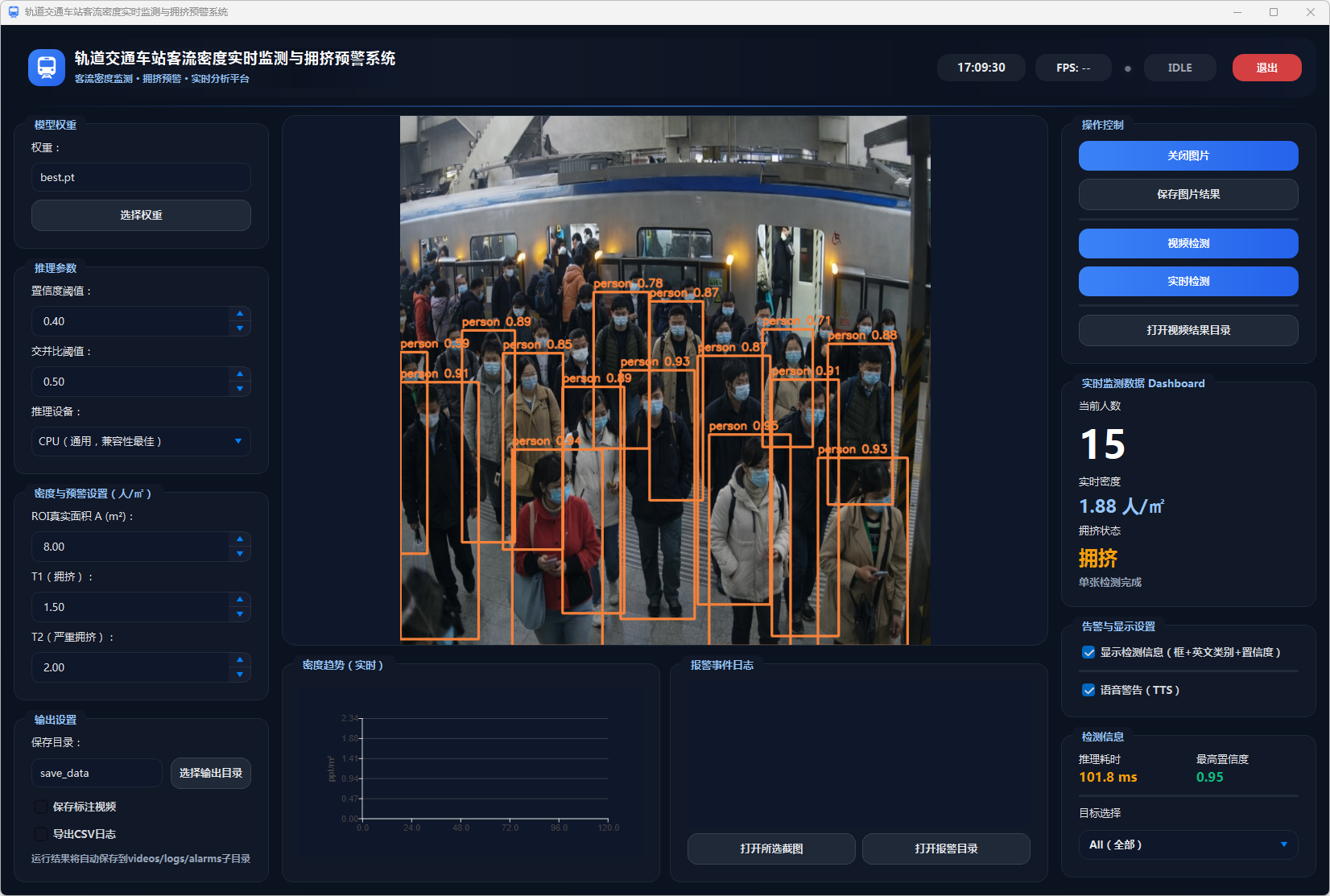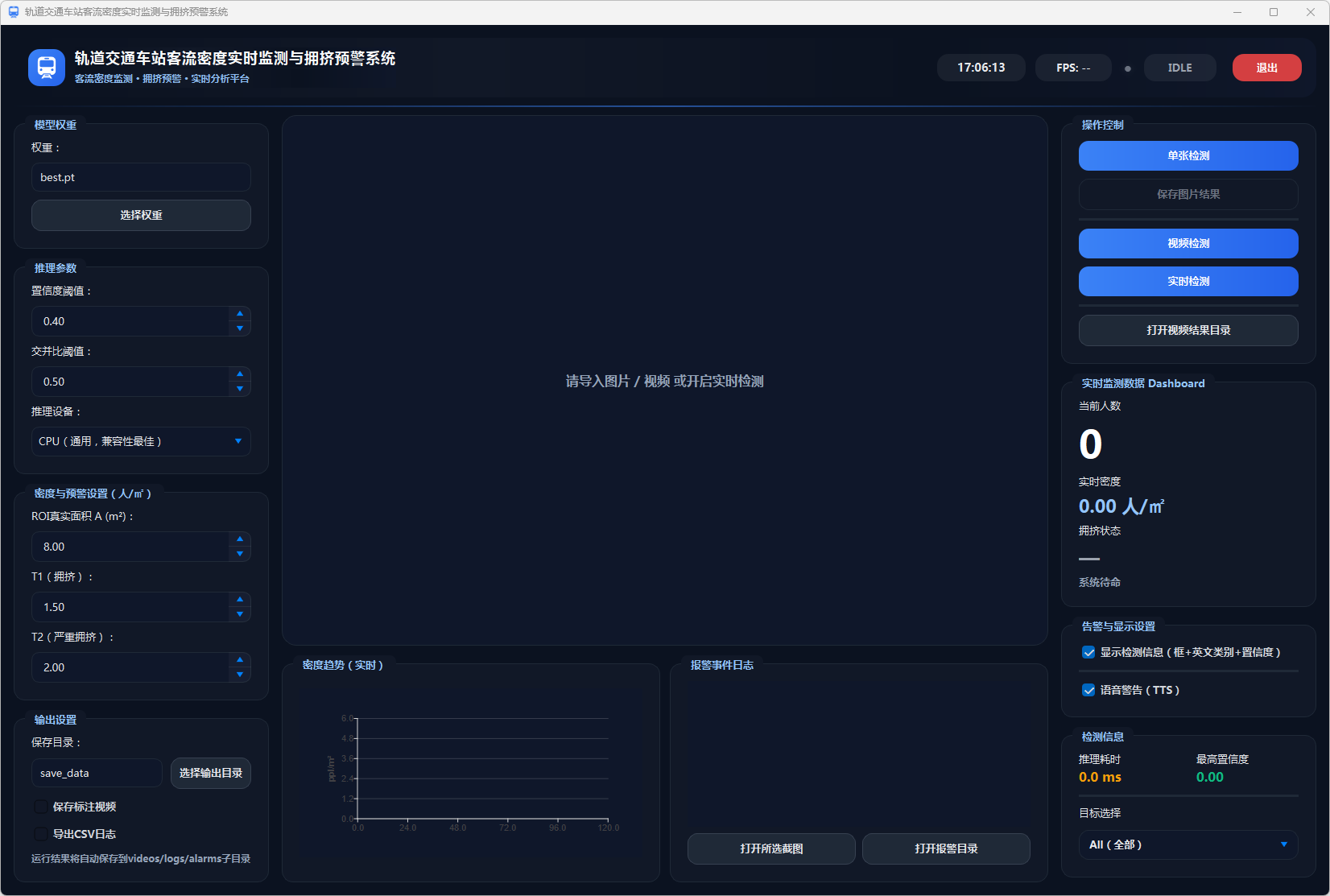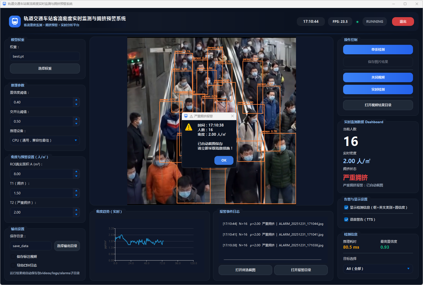 为了提高系统的易用性和可操作性,本文设计了图形用户界面(GUI),用户可以实时查看车站内的客流密度、预警状态以及相关统计信息。此外,系统支持数据导出功能,将检测结果以CSV格式进行保存,便于后期分析和决策支持。