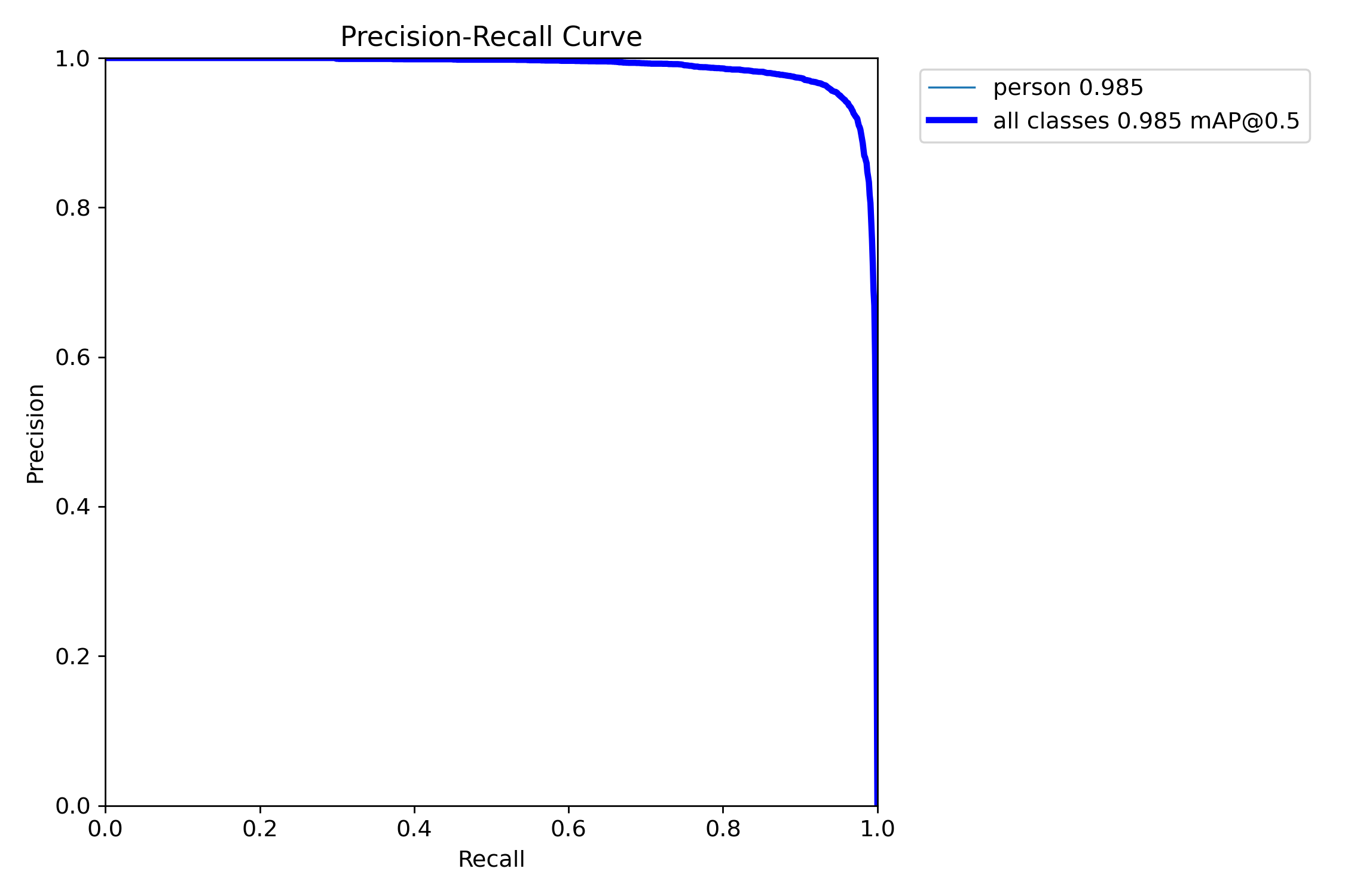 该图展示了精确度与召回率的关系,曲线表明模型在“person”类别的精确度和召回率均表现出很高的性能,且整体mAP@0.5值为0.985,表现出优秀的检测能力。