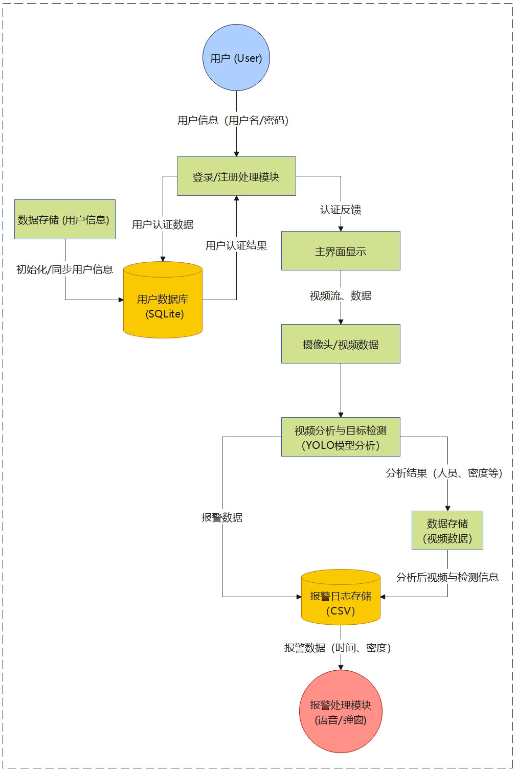 报警系统的工作流程包括从数据采集到报警执行的全过程。系统首先从摄像头获取视频流,通过目标检测模型(如YOLO)分析视频中的人群,统计出人数,并计算密度。一旦发现密度超过预设阈值,报警触发模块便会根据密度的等级触发相应的报警机制。在触发报警后,系统会根据冷却时间机制防止频繁报警。同时,报警事件会被自动记录到日志中,并保存报警截图,以便事后分析。