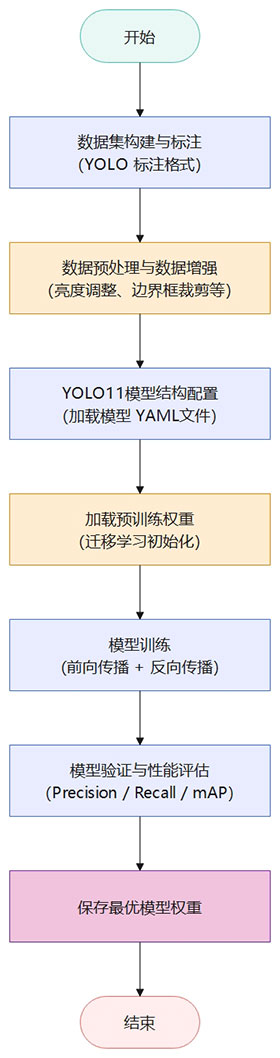 模型训练流程如图所示。首先,对轨道交通车站客流数据集进行规范标注,并采用 YOLO 标准格式生成标签文件;随后对样本进行尺寸归一化与数据增强处理,以提升模型对复杂场景的鲁棒性。在此基础上,构建 YOLOv11 目标检测模型并加载官方预训练权重,引入迁移学习机制以加快模型收敛。训练过程中,通过前向传播与反向传播不断优化网络参数,并在验证集上评估模型性能,最终保存性能最优的模型权重用于系统部署。