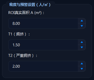 报警机制的触发依赖于实时监测和计算的客流密度。系统通过监控区域内的人数并结合实际区域面积来计算密度,公式为:密度 = 人数 / 区域面积(人/㎡)。然后,系统将计算出来的密度值与预设的安全阈值进行对比。如果密度超过设定的安全阈值,则触发报警。阈值分为两个等级:T1(拥挤)表示区域内人数密度达到一定水平时,需要关注,但不立即采取行动;而T2(严重拥挤)表示密度过高,必须立即采取疏导措施,防止安全事故发生。