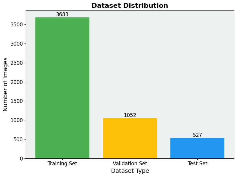 为保证模型训练与性能评估的客观性与可靠性,本文将所构建的数据集划分为训练集、验证集和测试集三部分。数据集按照 70% / 20% / 10% 的比例进行划分,其中训练集包含 3683 张图像,用于模型参数的学习;验证集包含 1052 张图像,用于模型超参数的调整与中间性能评估;测试集包含 527 张图像,用于对模型最终检测性能进行客观评估。该数据划分策略有助于系统性地分析模型的泛化性能。