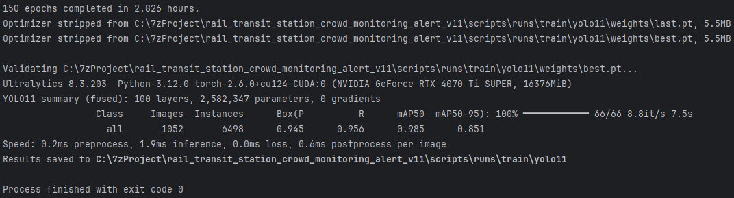 从训练与验证结果可以看出,YOLO11 模型在150个训练周期后完成的验证结果,其中 mAP50 为 0.985,表示模型在检测“person”类别时具有非常高的准确性。同时,mAP50-95 为 0.851,表明在多个IoU阈值下模型也保持了较好的性能。这表明该模型在车站客流密度监测中具有较强的适应性和较高的精度,能够有效执行目标检测任务。