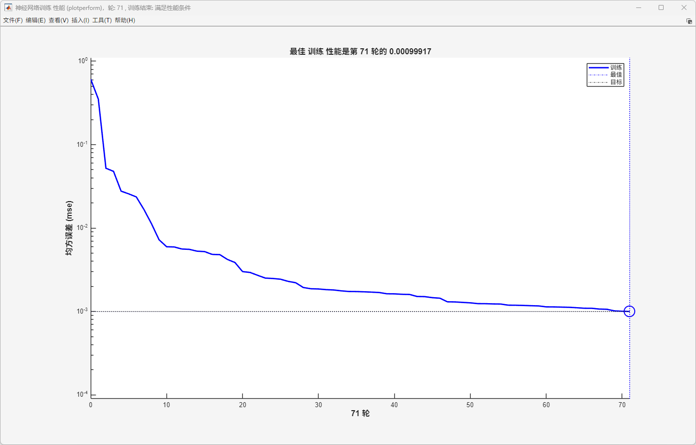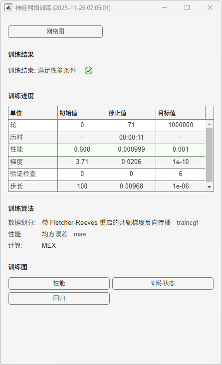 该图显示了 BP 神经网络在 MATLAB 神经网络工具箱中的训练过程信息。训练算法为 Fletcher–Reeves 共轭梯度法(traincgf),损失函数为均方误差(MSE)。训练在第 71 轮达到性能目标并自动停止,说明模型已满足设定的误差要求。