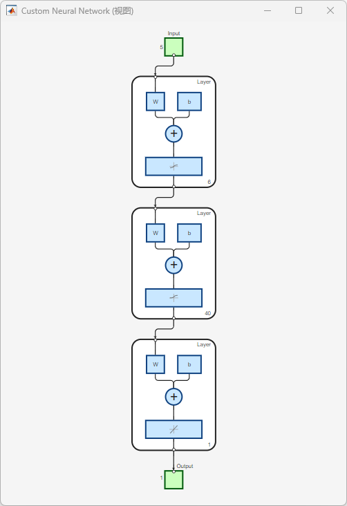 该图展示了本研究采用的 BP 神经网络模型结构。输入层包含 5 个节点,对应连续 5 天的负荷特征;网络包含两个隐含层,分别为 6 个和 40 个神经元;输出层包含 1 个节点,用于预测目标日相同时间点的负荷值。各层之间采用前馈连接方式。