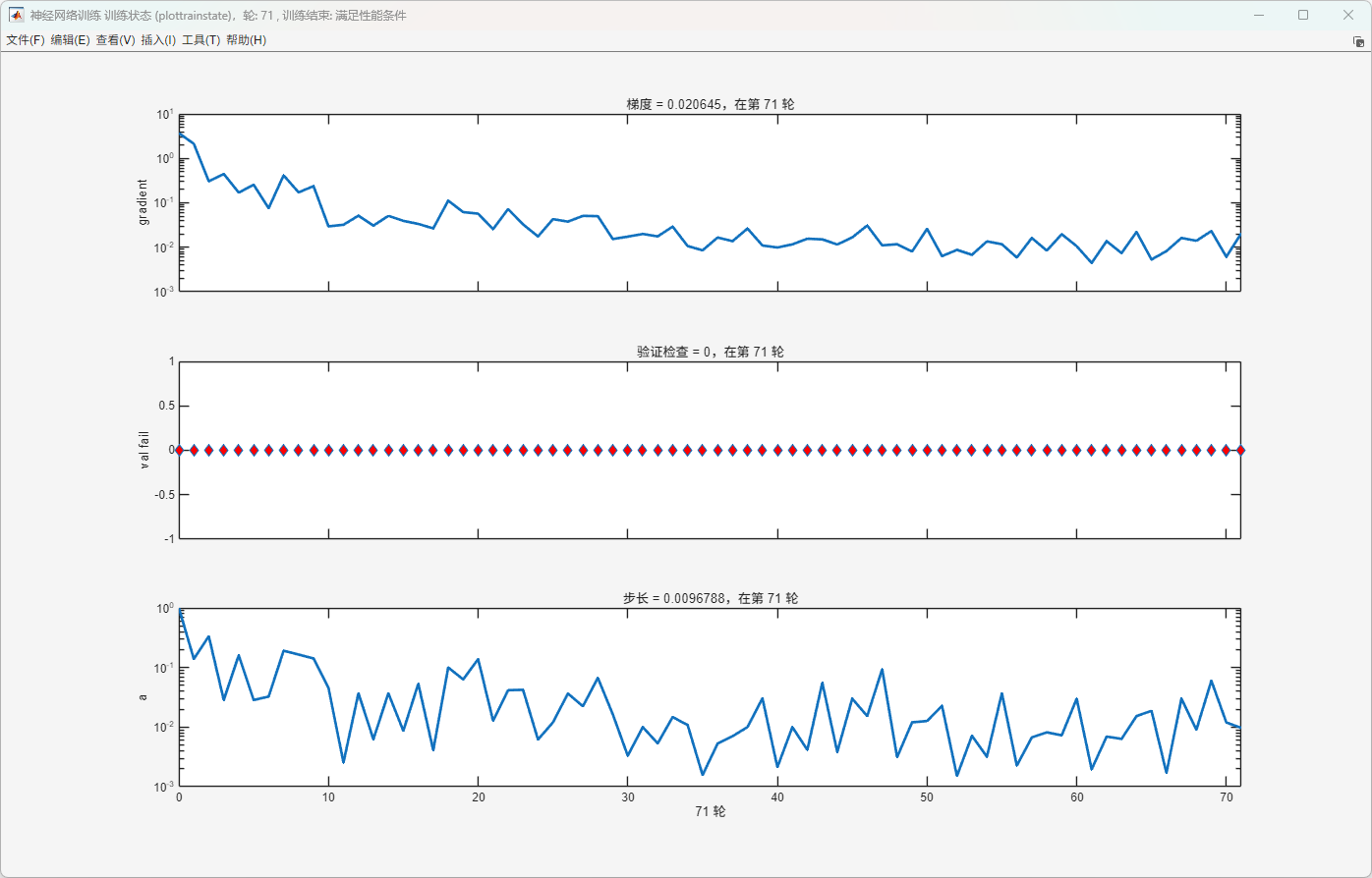 图中分别显示了训练过程中的梯度、验证检查次数和步长变化情况。梯度整体呈下降趋势,表明网络参数逐步收敛;验证检查次数保持为 0,说明未触发提前停止条件;步长随优化过程动态变化,符合共轭梯度法的特性。