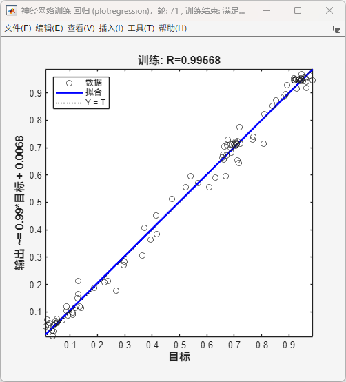 该图展示了网络输出与目标值之间的回归关系。散点为实际训练样本,蓝色直线为拟合线。拟合斜率接近 1 且相关系数 R=0.99568,表明网络输出与真实目标值具有良好一致性,预测精度较高。