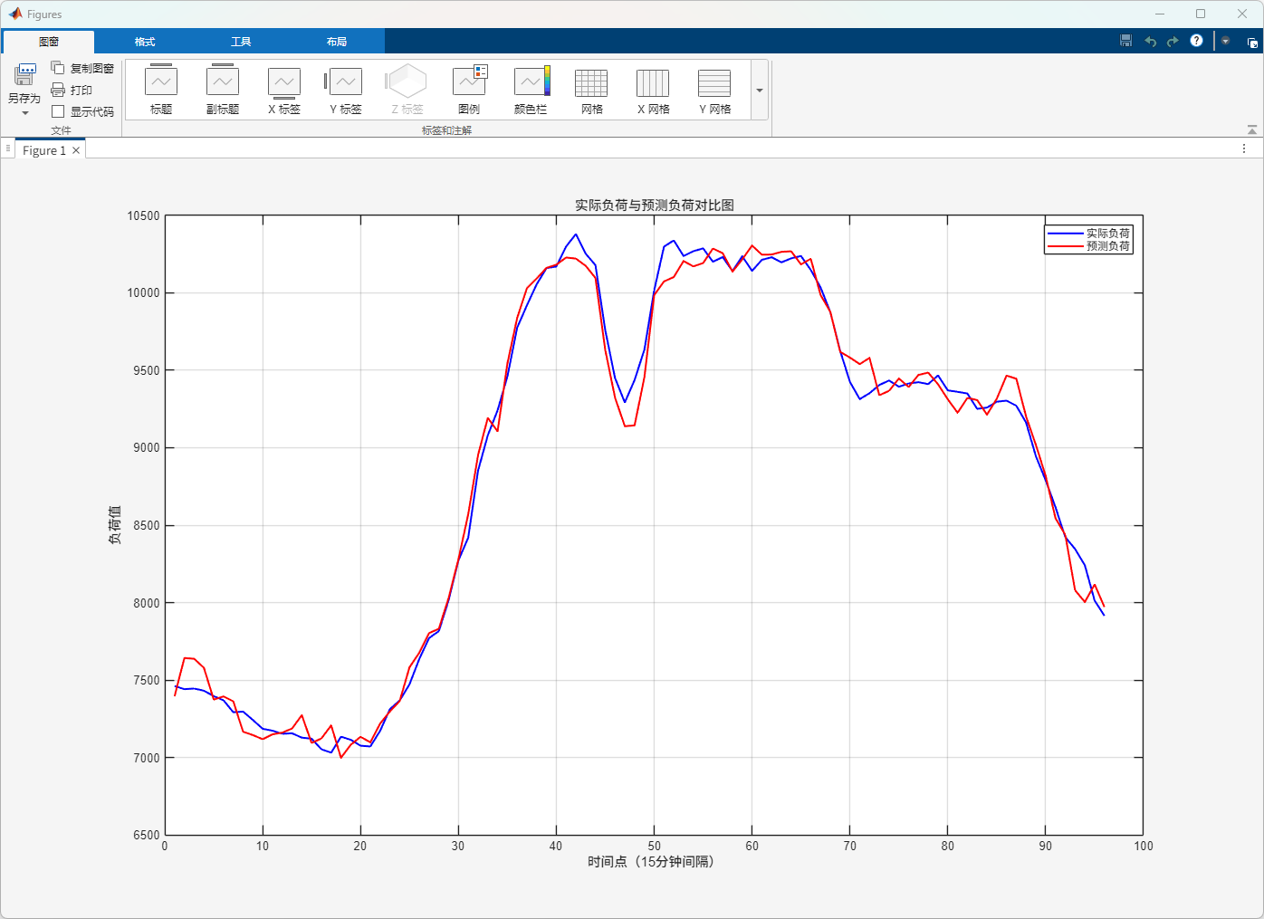 该图对比了 BP 神经网络预测负荷与实际负荷曲线。总体来看,预测曲线较好地跟随了实际负荷的变化趋势,在早晚波动、峰值与谷值附近能够保持较高的拟合度。局部误差主要出现在峰值附近,属于短期负荷预测中的常见现象。