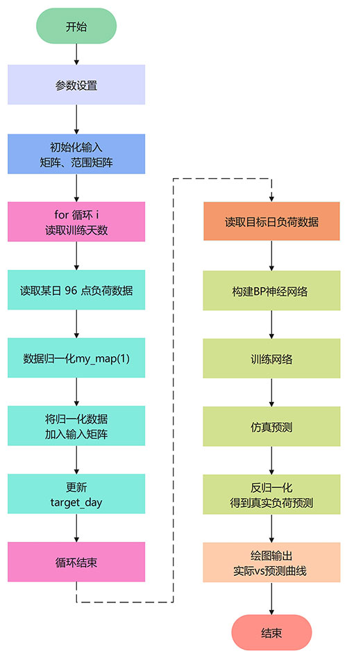 本系统通过 MATLAB 编程实现数据读取、归一化处理、BP 神经网络训练与负荷预测的完整流程。