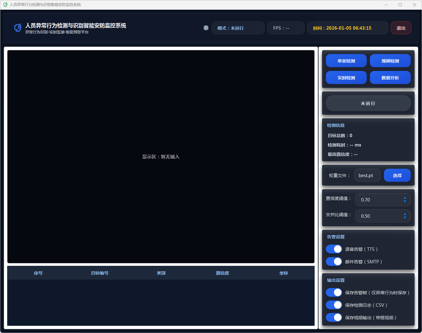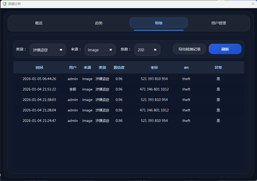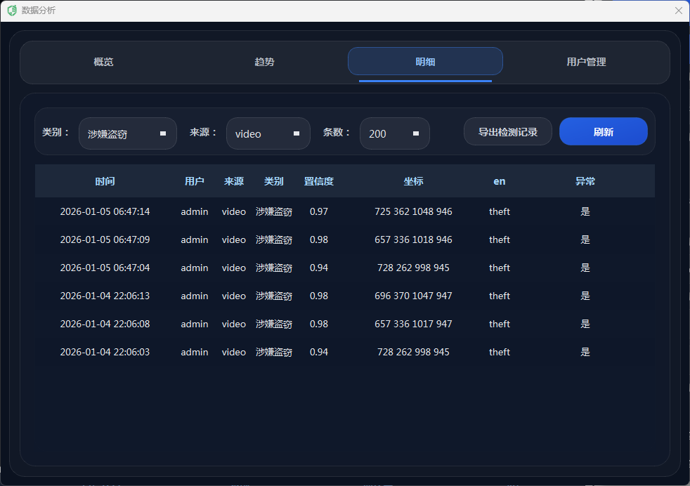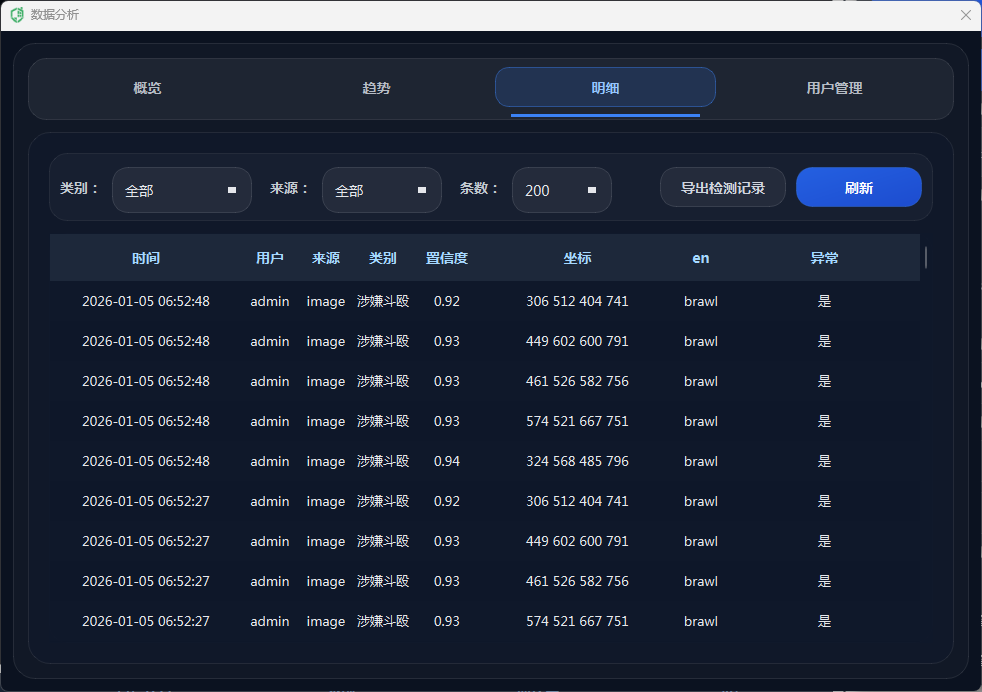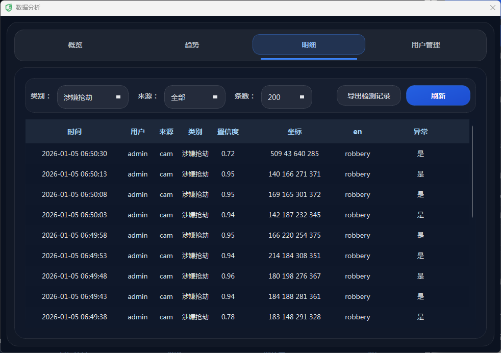 为避免频繁重复报警导致干扰,系统引入冷却时间控制与节流机制:同一异常类别在短时间内重复出现时会被抑制,只有超过冷却间隔才再次触发语音/邮件与截图保存;此外,数据库写入同样设置写入冷却,减少高帧率下的重复记录与存储压力。通过“实时触发 + 多通道联动 + 冷却抑制”的组合,系统在保证及时性的同时提升告警质量与可用性。