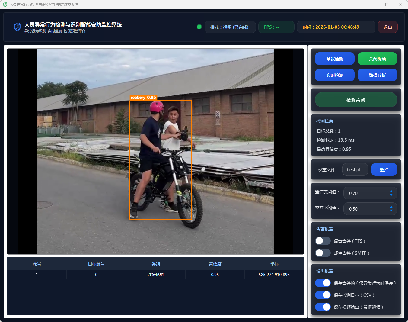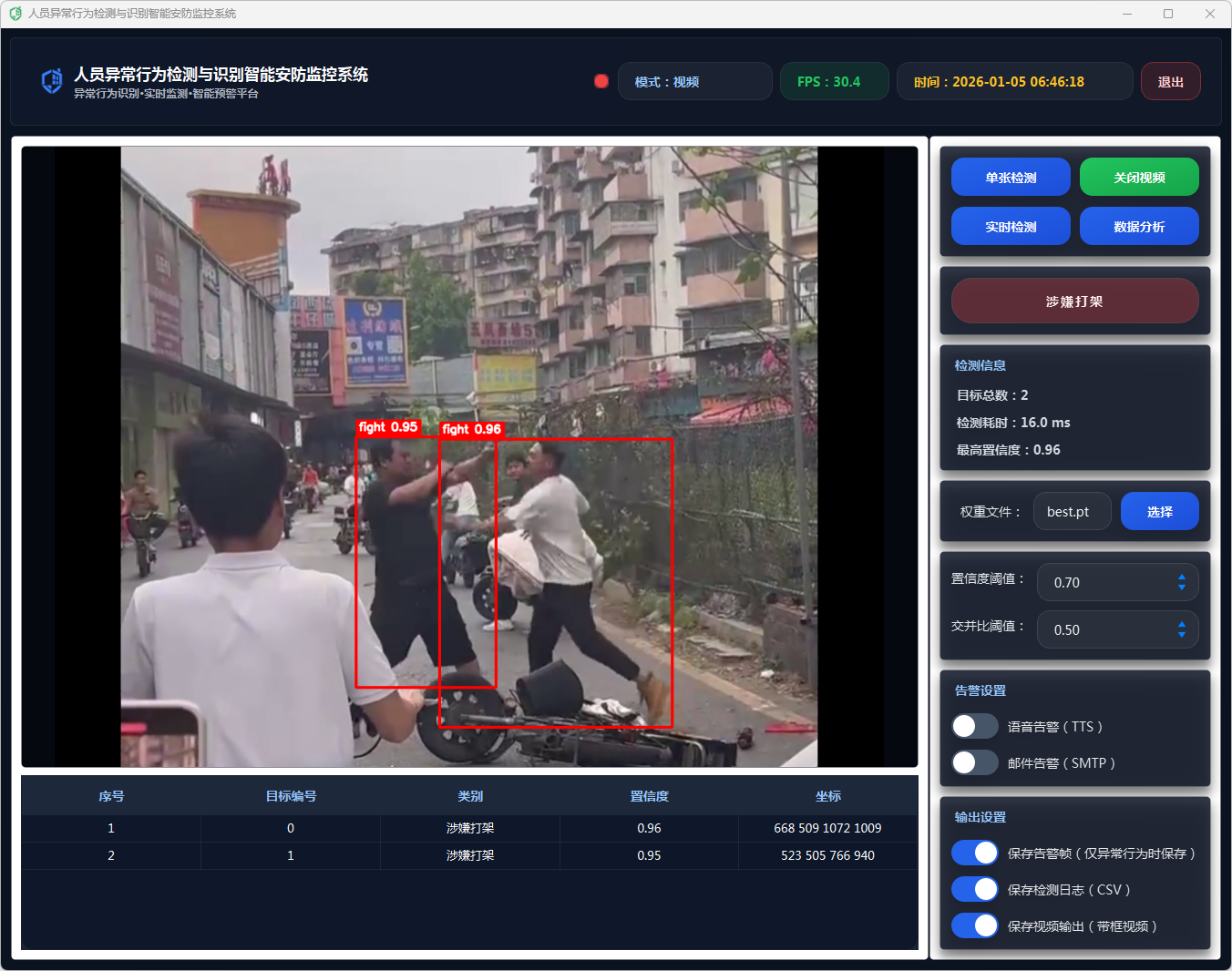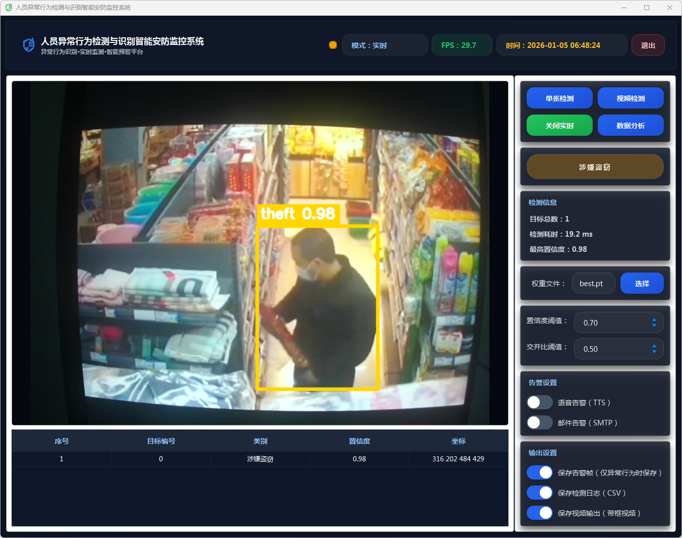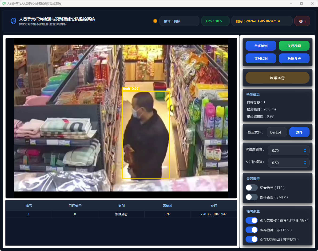 在告警动作执行上,系统采用多通道联动策略:当检测到异常行为且满足触发条件时,自动生成告警文本(包含异常类别与置信度),并根据用户在界面中开启的开关选择执行语音告警(TTS播报)与邮件告警(SMTP发送通知);同时可选保存告警帧,将当前带标注的画面截图落盘,便于后续追溯取证与复核分析,实现“发现—通知—留痕”的闭环。