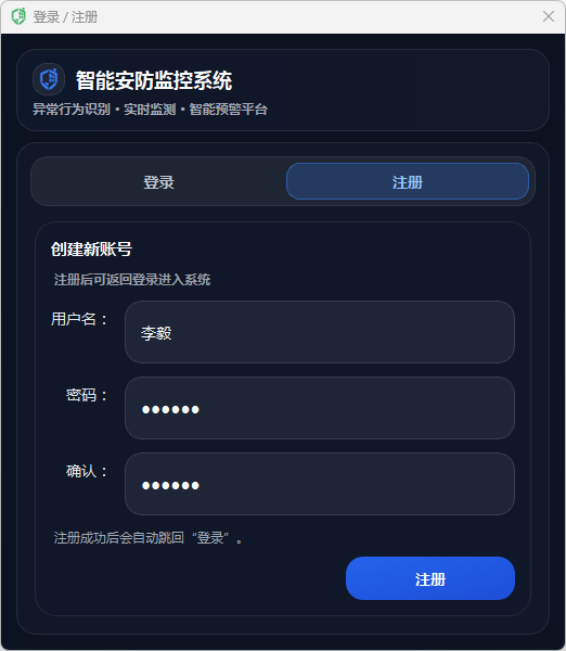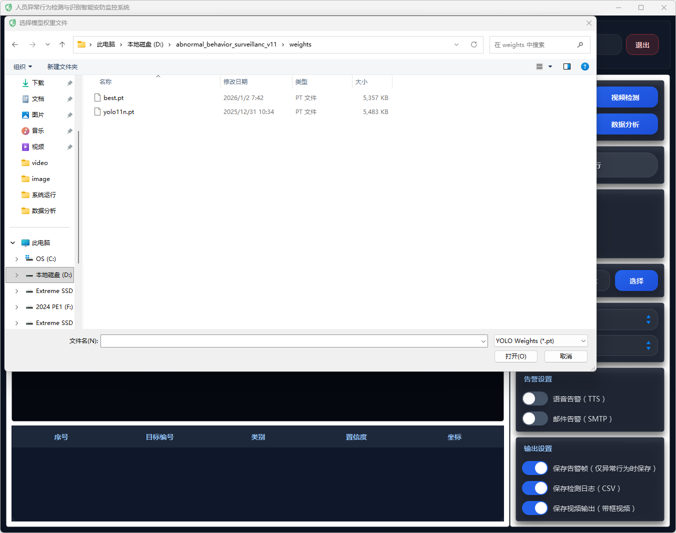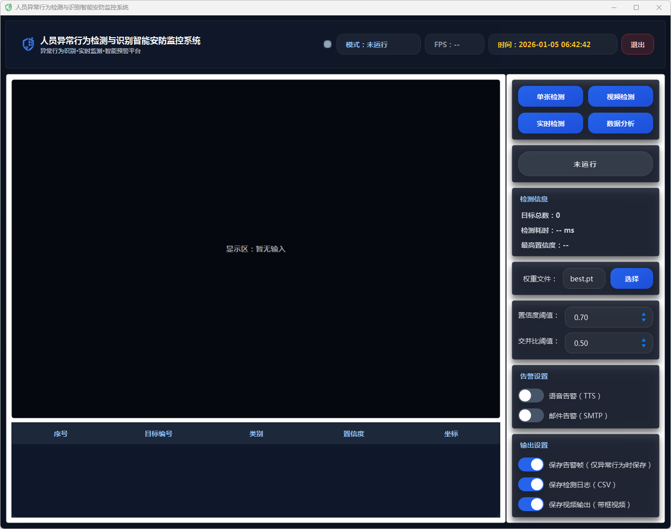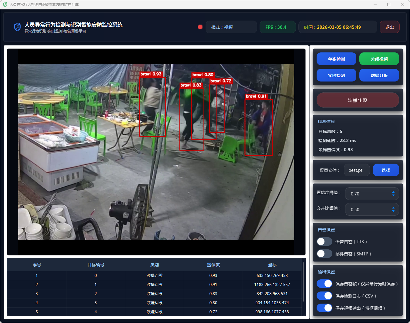 在告警动作执行上,系统采用多通道联动策略:当检测到异常行为且满足触发条件时,自动生成告警文本(包含异常类别与置信度),并根据用户在界面中开启的开关选择执行语音告警(TTS播报)与邮件告警(SMTP发送通知);同时可选保存告警帧,将当前带标注的画面截图落盘,便于后续追溯取证与复核分析,实现“发现—通知—留痕”的闭环。
