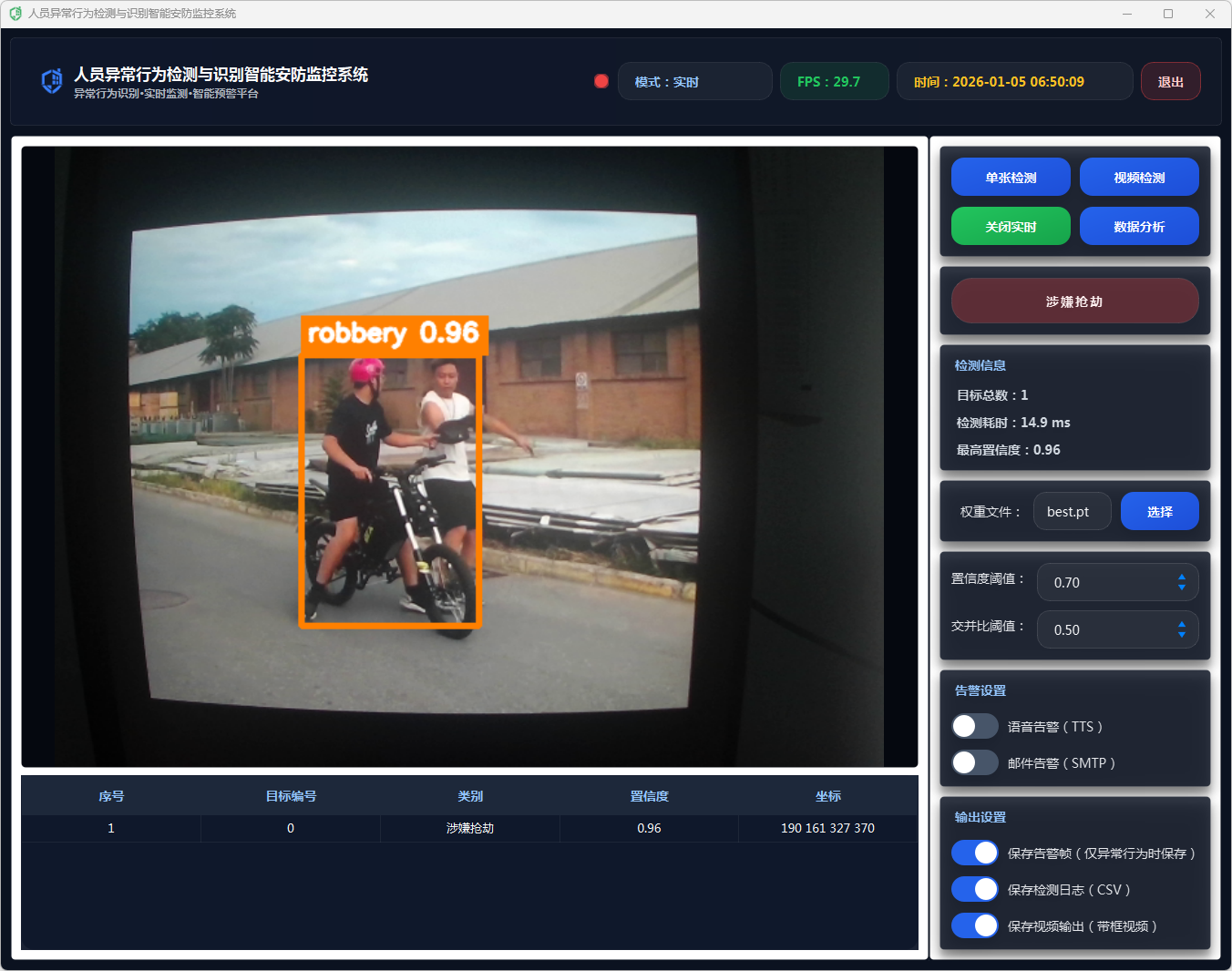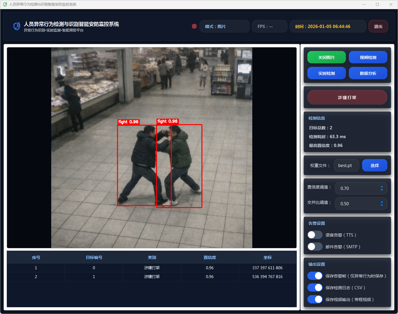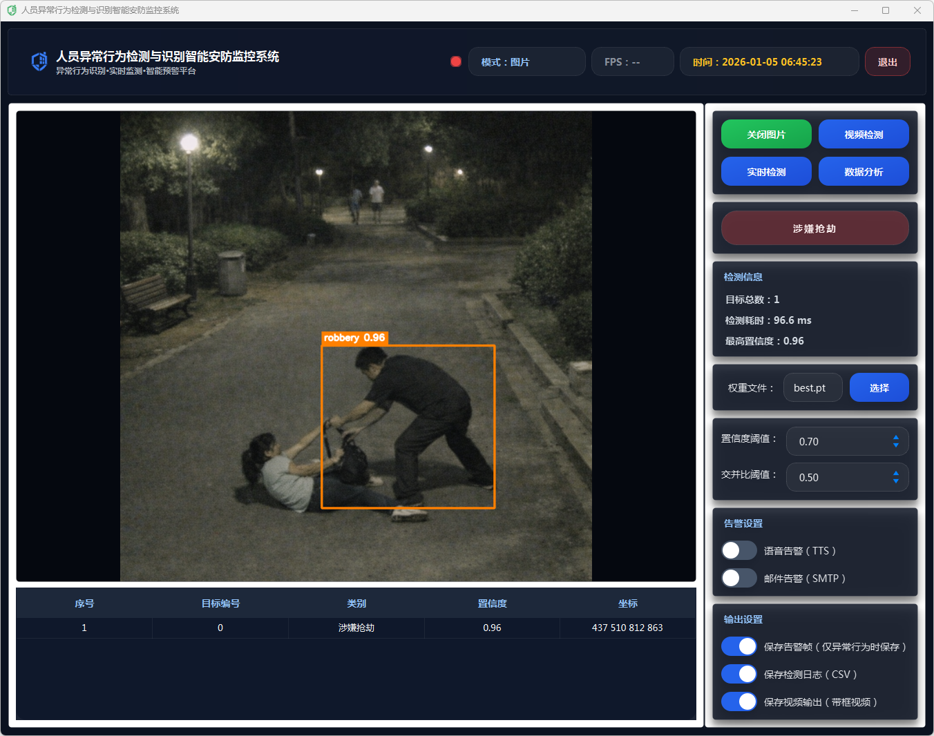 该系统通过采用YOLOv11深度学习模型进行目标检测,结合多种数据处理方法,精确识别异常行为。系统提供了友好的用户界面,支持单张图像检测和视频流实时分析,能够显示检测结果,包括行为类别、置信度、检测时间等信息。在检测到异常行为时,系统会通过语音告警和邮件告警功能及时通知相关人员,确保安全事件能够迅速得到响应。