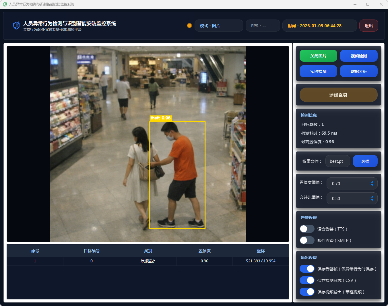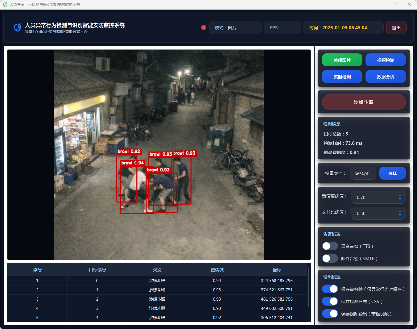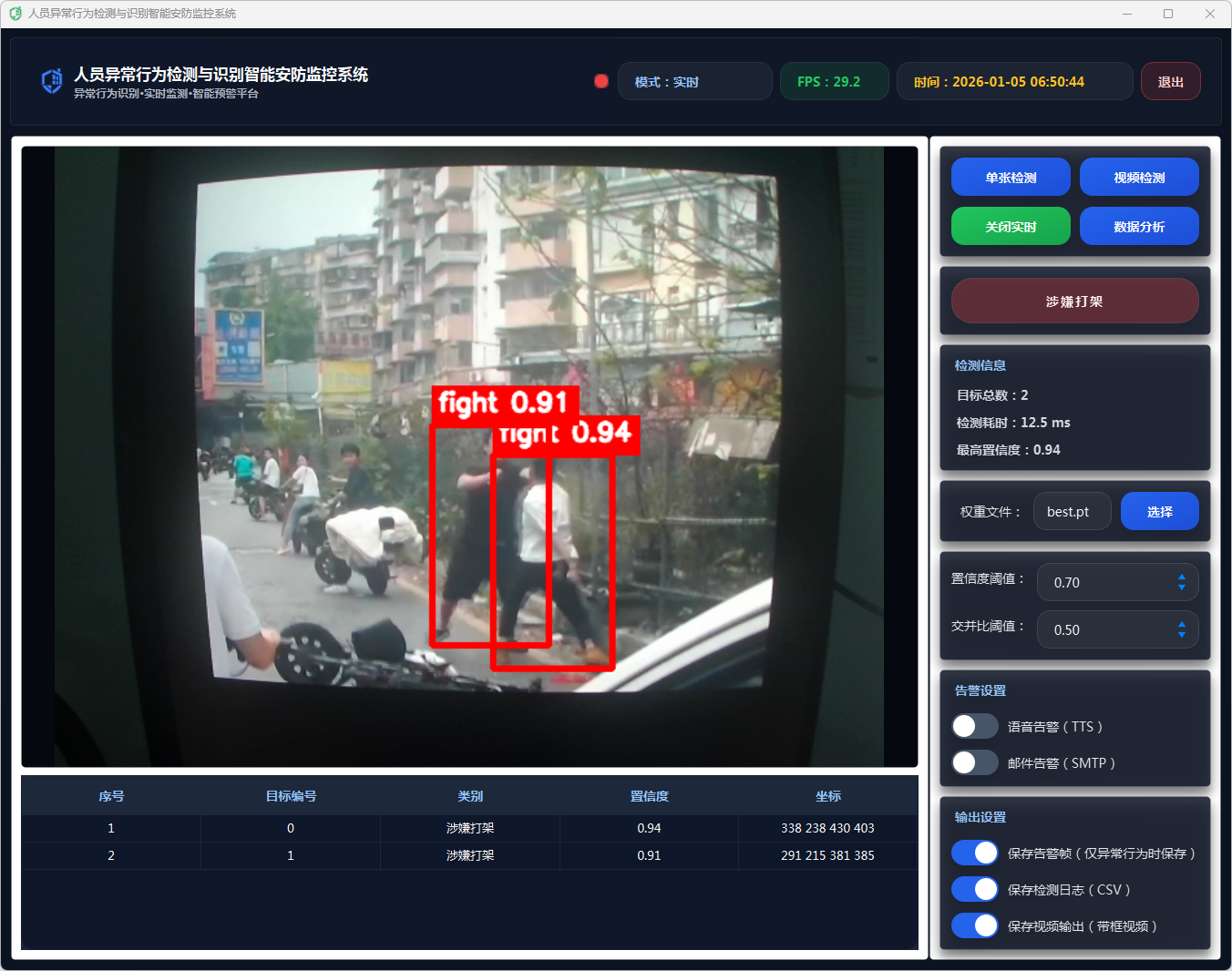 该系统通过采用YOLOv11深度学习模型进行目标检测,结合多种数据处理方法,精确识别异常行为。系统提供了友好的用户界面,支持单张图像检测和视频流实时分析,能够显示检测结果,包括行为类别、置信度、检测时间等信息。在检测到异常行为时,系统会通过语音告警和邮件告警功能及时通知相关人员,确保安全事件能够迅速得到响应。