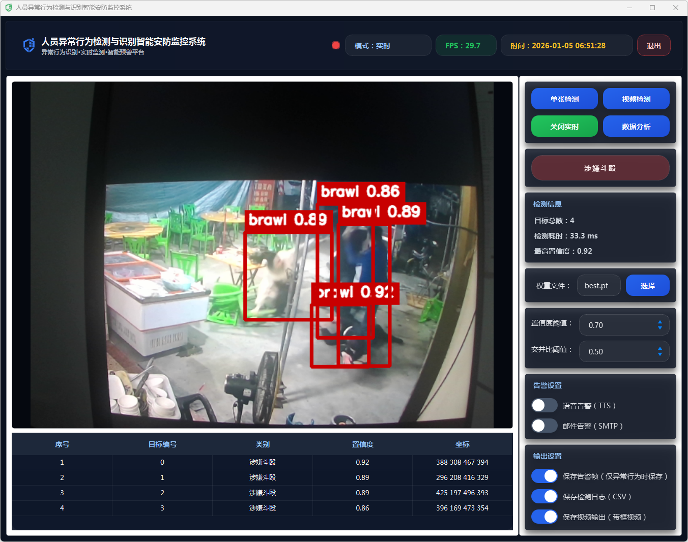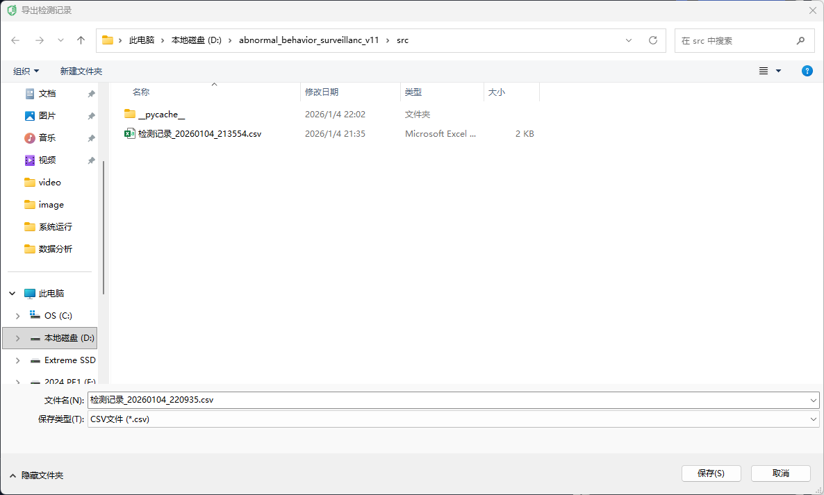 为了验证系统的性能,本研究在多个实际场景中进行了实验评估。实验结果表明,系统在各种环境中的适应性和稳定性较好,能够有效提高公共场所的安全性。此外,系统还提供了数据保存、CSV导出、告警配置等功能,便于后期数据分析和审计。