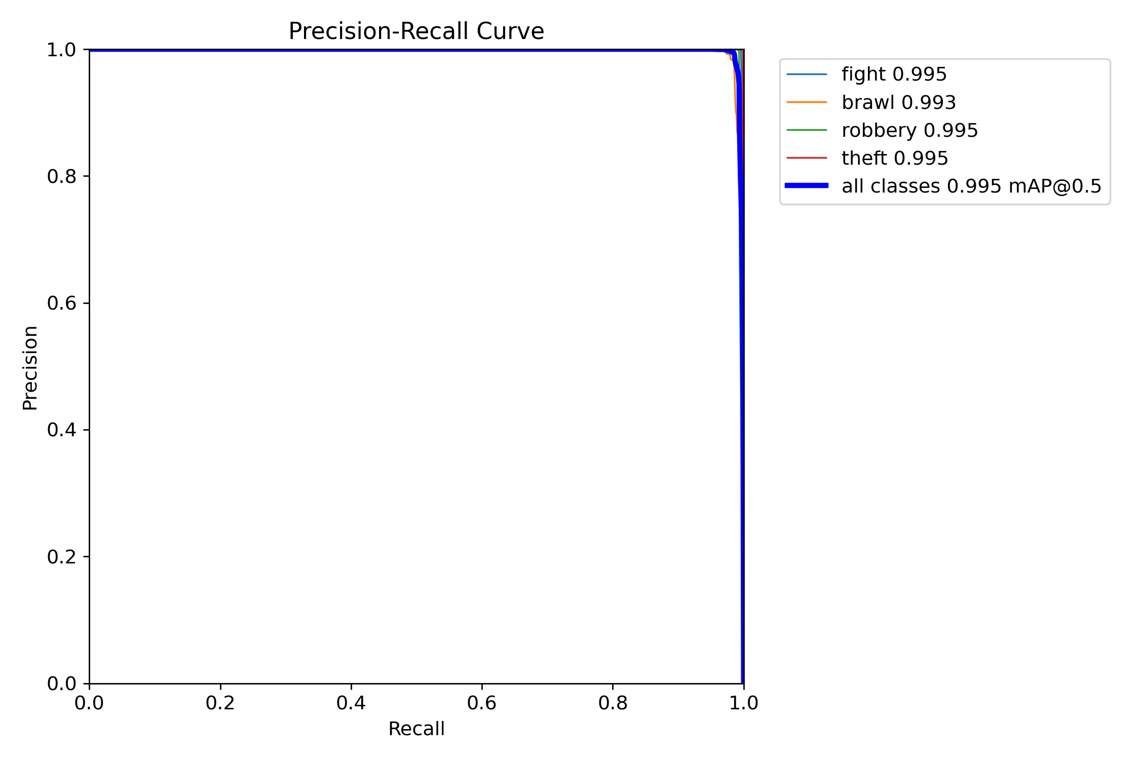 从 PR 曲线可以看出,各类异常行为的精确率在高召回率区间仍保持接近 1.0,整体 mAP@0.5 达到 0.995,表明基于 YOLO11 的模型在人员异常行为检测任务中具有极高的检测精度与稳定性。