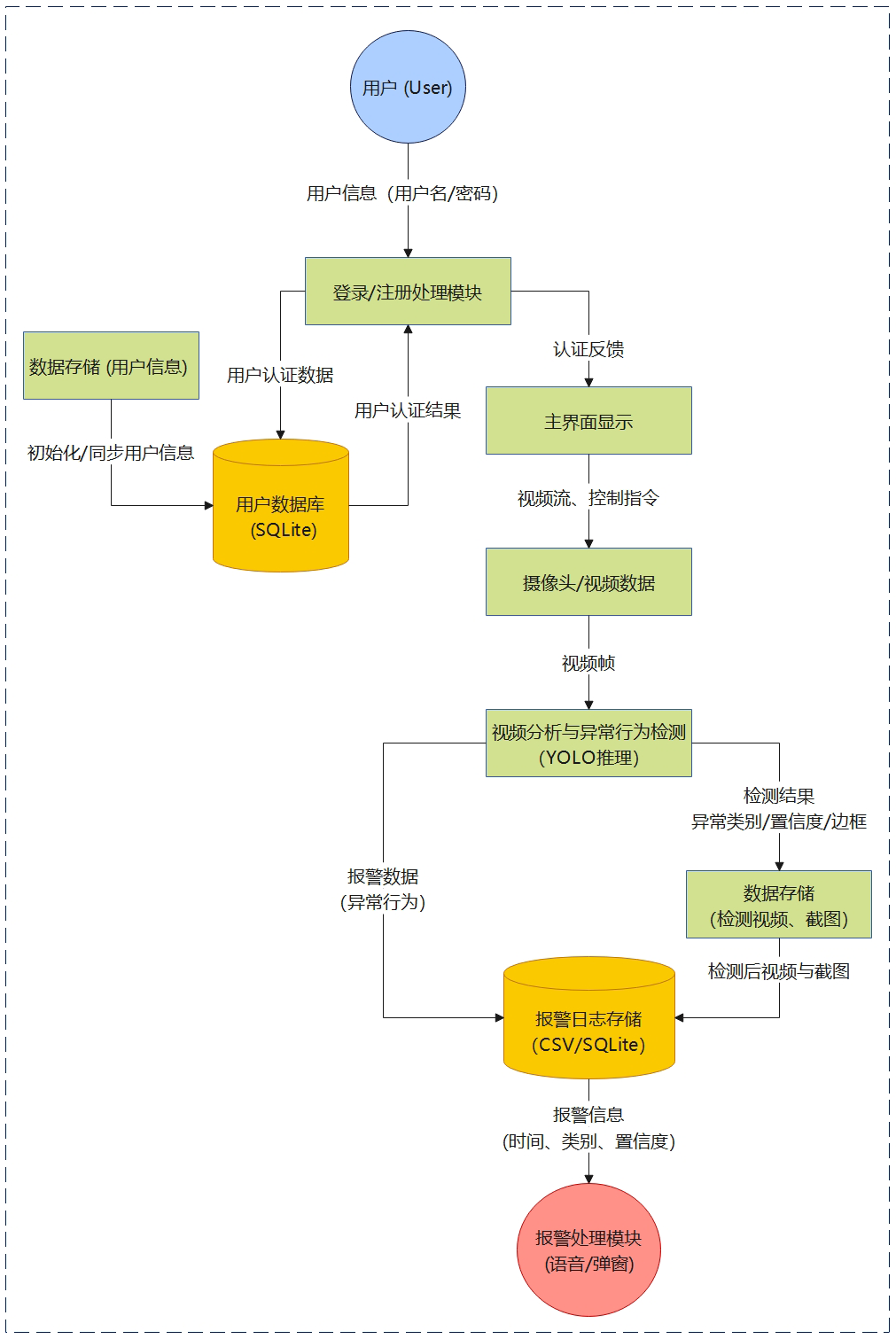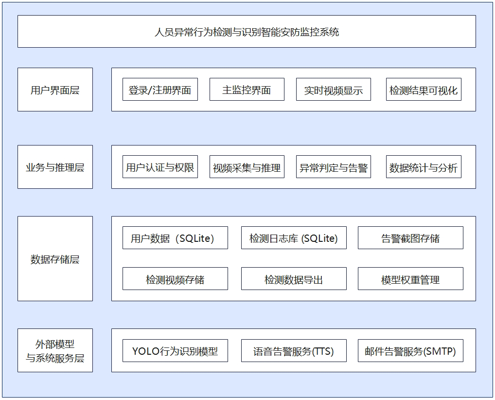 本系统采用分层架构设计,通过用户界面层实现交互与可视化展示,业务与推理层完成视频采集、异常行为识别与告警策略控制,数据管理层负责检测结果与用户信息的统一存储,并结合外部模型与服务实现智能分析与实时告警。