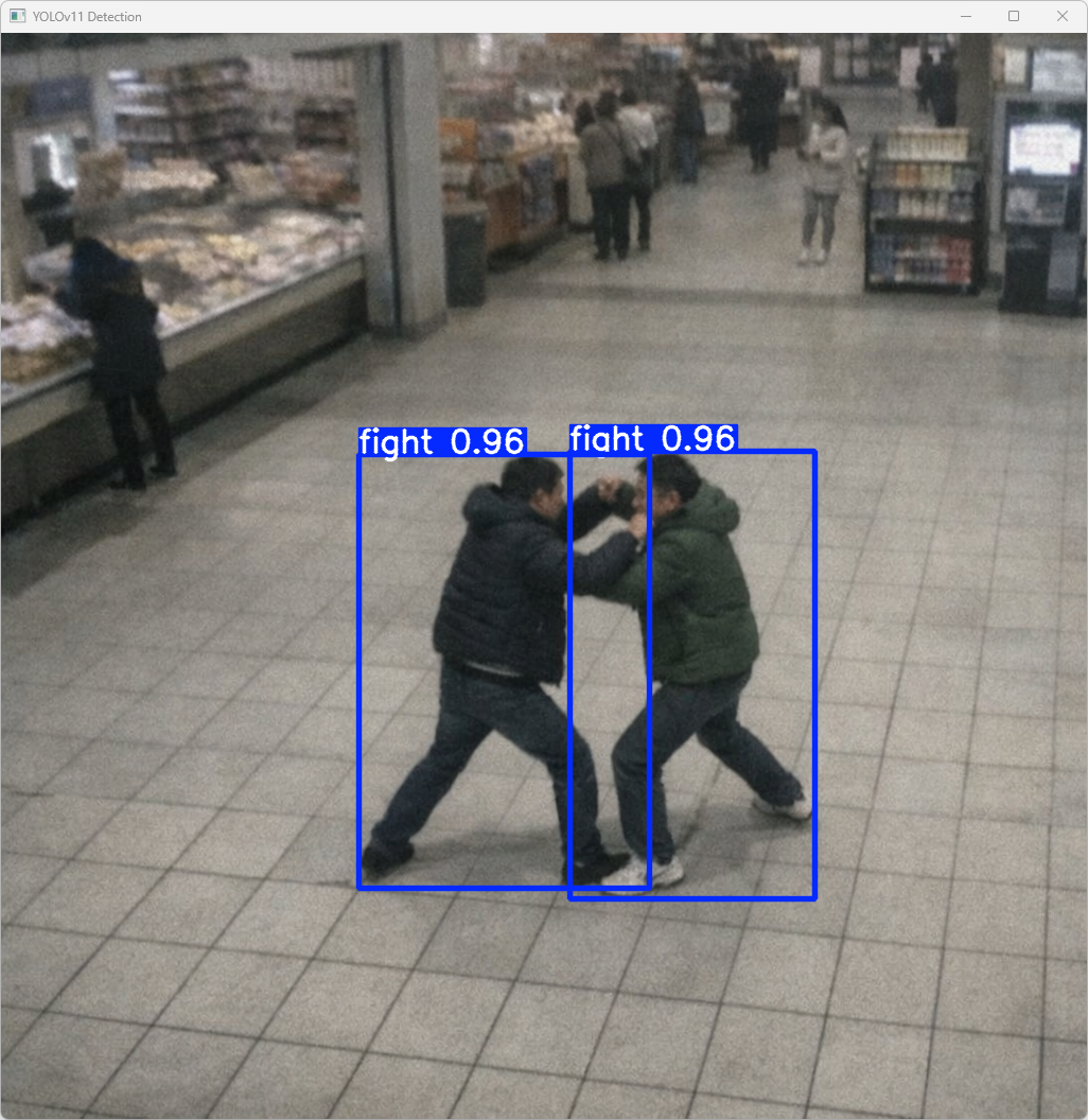 测试结果表明,基于 YOLO11 的人员异常行为检测模型能够在单张图像上快速、准确地识别异常行为(如打架行为),整体推理耗时较低,满足实际智能安防系统对实时性与检测精度的应用需求。