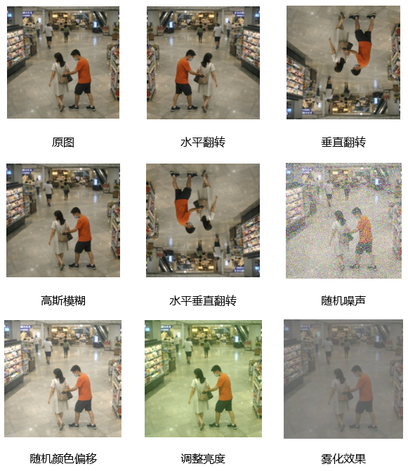在具体实现过程中,本文综合采用几何变换与图像质量扰动相结合的数据增强方法。在几何变换方面,对原始监控图像进行水平翻转、垂直翻转以及水平与垂直组合翻转处理,以模拟不同摄像机安装角度、监控视角变化以及人员姿态差异对异常行为检测结果的影响;在图像质量扰动方面,引入高斯模糊、随机噪声、雾化处理、随机颜色偏移及亮度调节等增强方式,用于模拟实际安防场景中常见的光照变化、画面模糊、环境干扰等复杂因素。