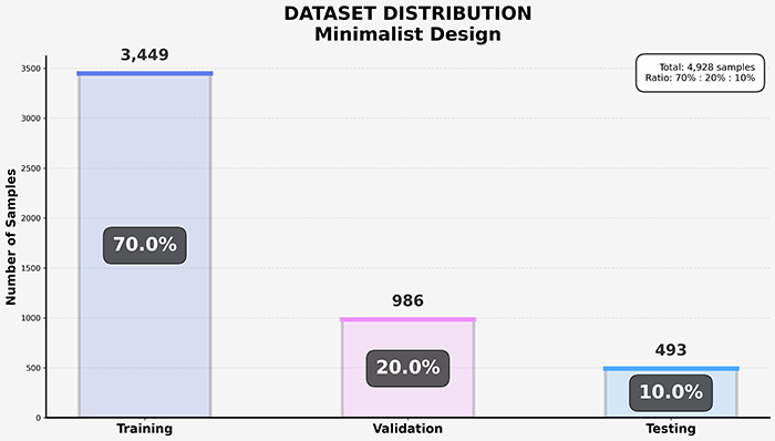 为保证模型训练与测试阶段的客观性、稳定性与评估可靠性,本文对构建的数据集进行了科学划分,将其分为训练集、验证集和测试集三部分。数据集按照 70% / 20% / 10% 的比例进行划分,其中训练集包含 3449 张图像,主要用于 YOLO11 模型参数的学习与异常行为特征表示能力的建立;验证集包含 986 张图像,用于模型超参数调优、训练过程监控以及中间性能评估;测试集包含 493 张图像,用于在完全未参与训练的条件下,对模型最终的人员异常行为检测与识别性能进行客观验证。该数据划分策略能够有效避免数据泄漏问题,并有助于系统性分析模型在复杂智能安防监控场景下的泛化能力与实际应用性能。