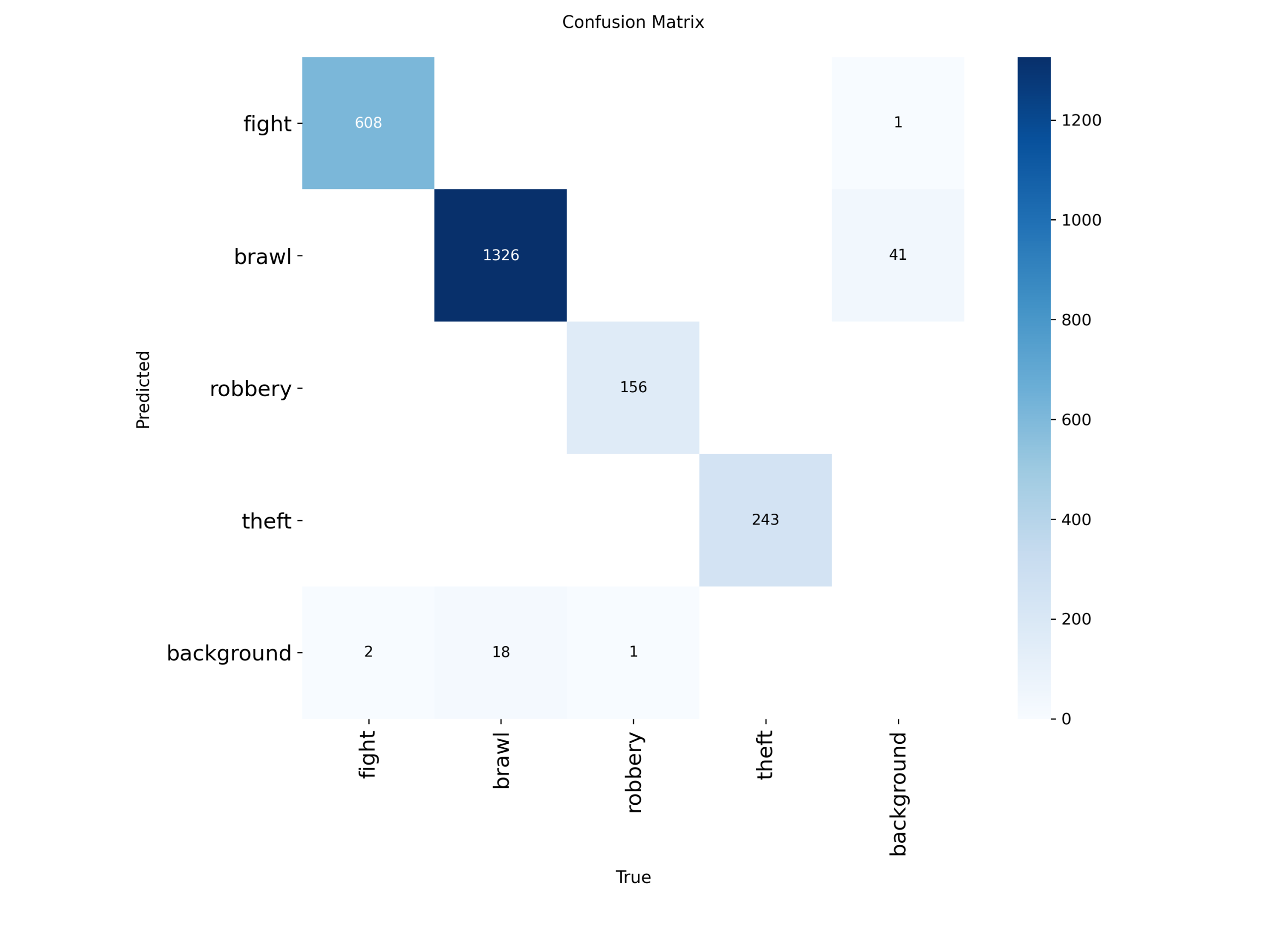 从混淆矩阵可以看出,各类异常行为样本主要集中在对角线位置,类别识别准确率较高,仅在少量样本中与背景或相近行为发生混淆,表明模型具备良好的类别区分能力与整体检测稳定性。