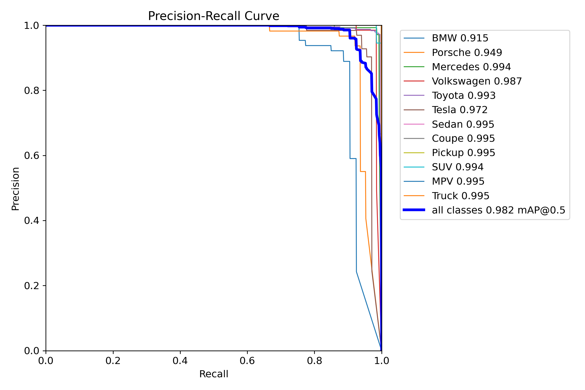 从 Precision–Recall 曲线可以看出,模型在各车辆品牌与车型类别上均保持较高的精确率与召回率,整体 mAP@0.5 达到 0.982,表明基于 YOLO11 的车辆品牌与类型识别模型在多类别检测任务中具有优良的综合性能与稳定性。