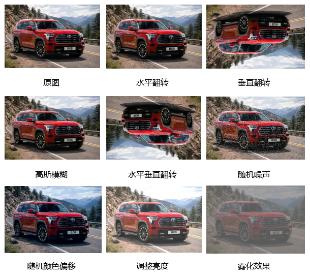 在实现过程中,本文面向车辆品牌与车型识别的成像特点,采用几何变换与图像质量扰动相结合的数据增强策略,以提升模型在多视角、多光照与复杂背景下的鲁棒性。几何变换包括水平/垂直及组合翻转,用于模拟摄像机角度与车辆行驶方向变化;质量扰动包括高斯模糊、随机噪声、雾化(低对比度)、颜色偏移与亮度调节,用于模拟雨雾、光照波动、运动模糊等真实监控干扰。