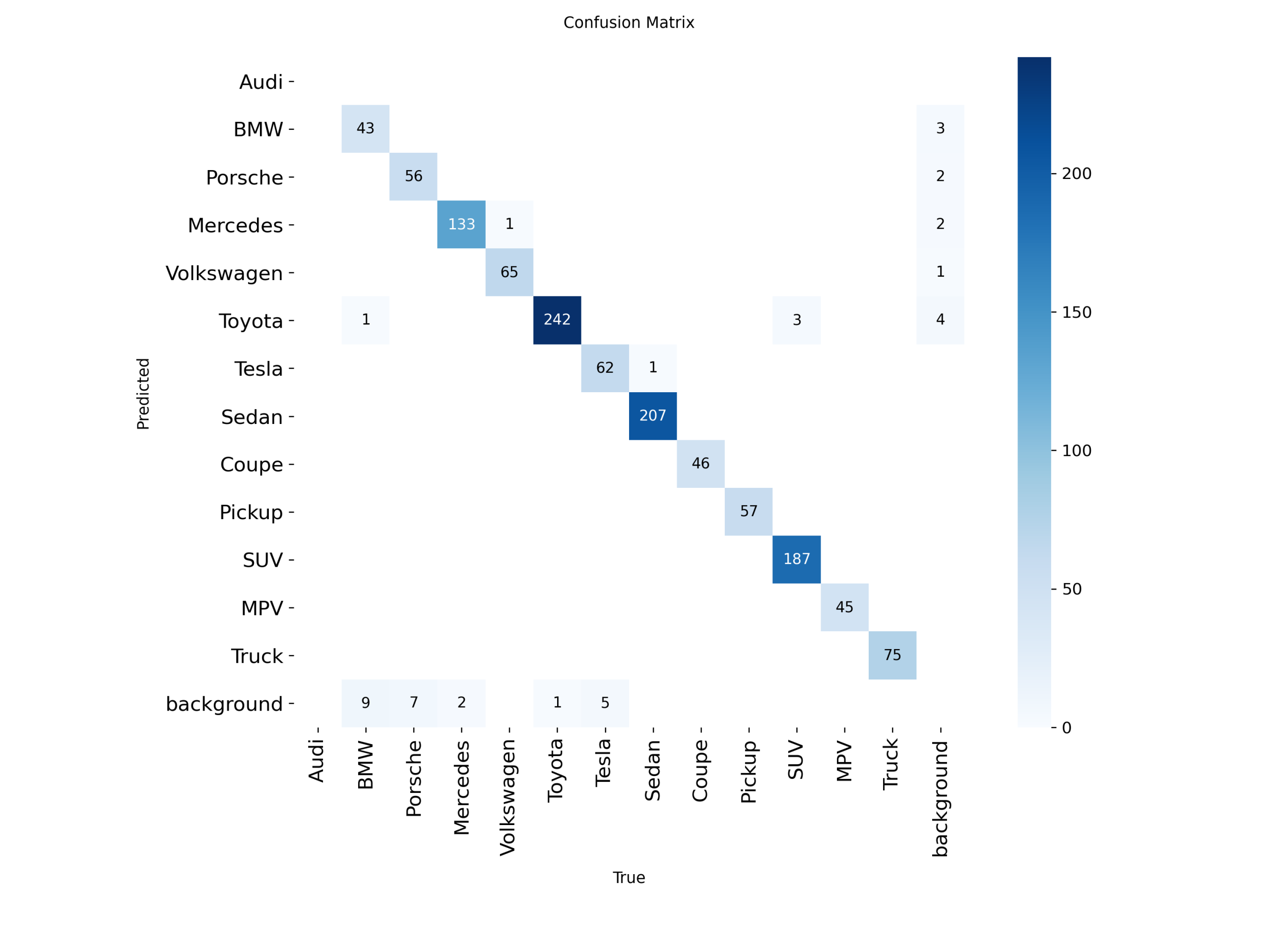 从混淆矩阵可以看出,模型在各车辆品牌与车型类别上的预测结果主要集中在对角线区域,仅在少数外观相近类别之间存在轻微混淆,整体分类准确性较高,表明基于 YOLO11 的车辆品牌与类型识别模型具有良好的判别能力与稳定性。