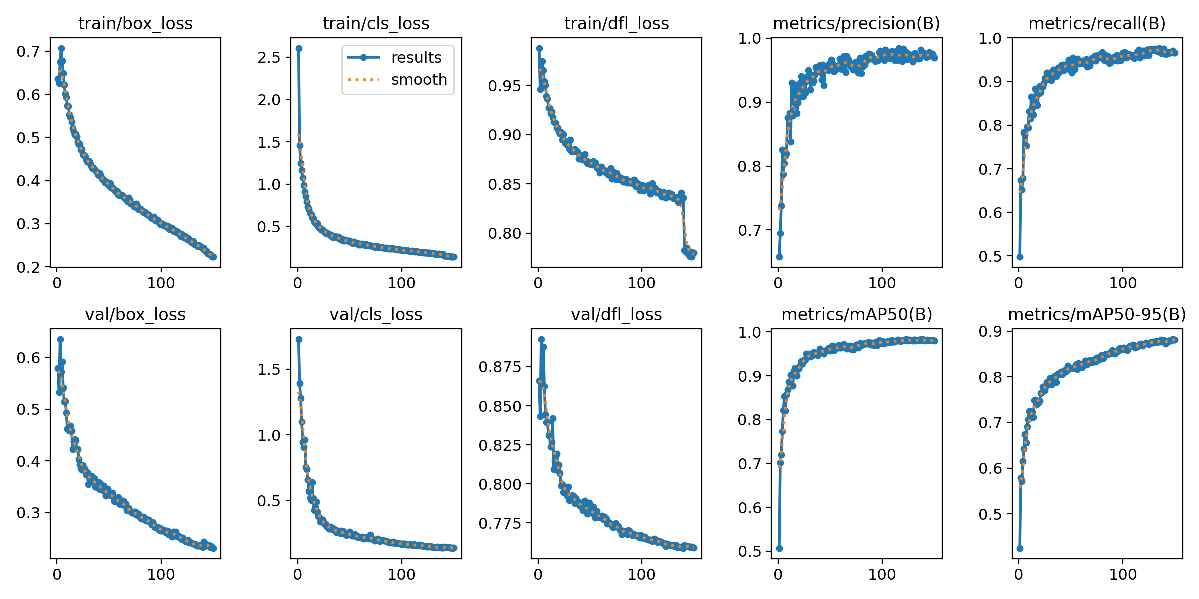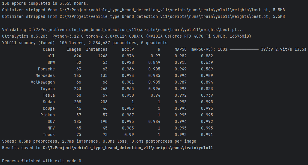 实验结果表明,经过 150 个训练轮次后,YOLO11 模型在车辆品牌与车型识别任务上取得了优异性能,整体 mAP@0.5 达到 0.982、mAP@0.5–0.95 达到 0.882,各类别精确率与召回率均保持较高水平,验证了模型在复杂场景下的检测准确性与稳定性。