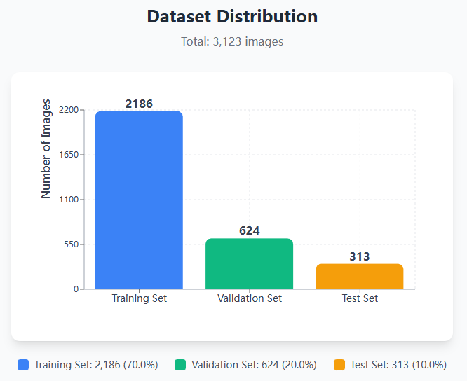 为保证模型在训练与测试阶段的客观性、稳定性与评估可靠性,本文对构建的车辆品牌与车型识别数据集进行了科学划分,将其分为训练集、验证集和测试集三部分。数据集按照 70% / 20% / 10% 的比例进行划分,其中训练集包含 2186 张图像,主要用于 YOLO11 模型参数学习与车辆外观特征表示能力的建立;验证集包含 624 张图像,用于模型超参数调优、训练过程监控以及中间性能评估;测试集包含 313 张图像,用于在完全未参与训练的条件下,对模型最终的车辆品牌与车型识别性能进行客观验证。该数据划分策略能够有效避免数据泄漏问题,并有助于系统性分析模型在复杂道路与监控场景下的泛化能力与实际应用表现。