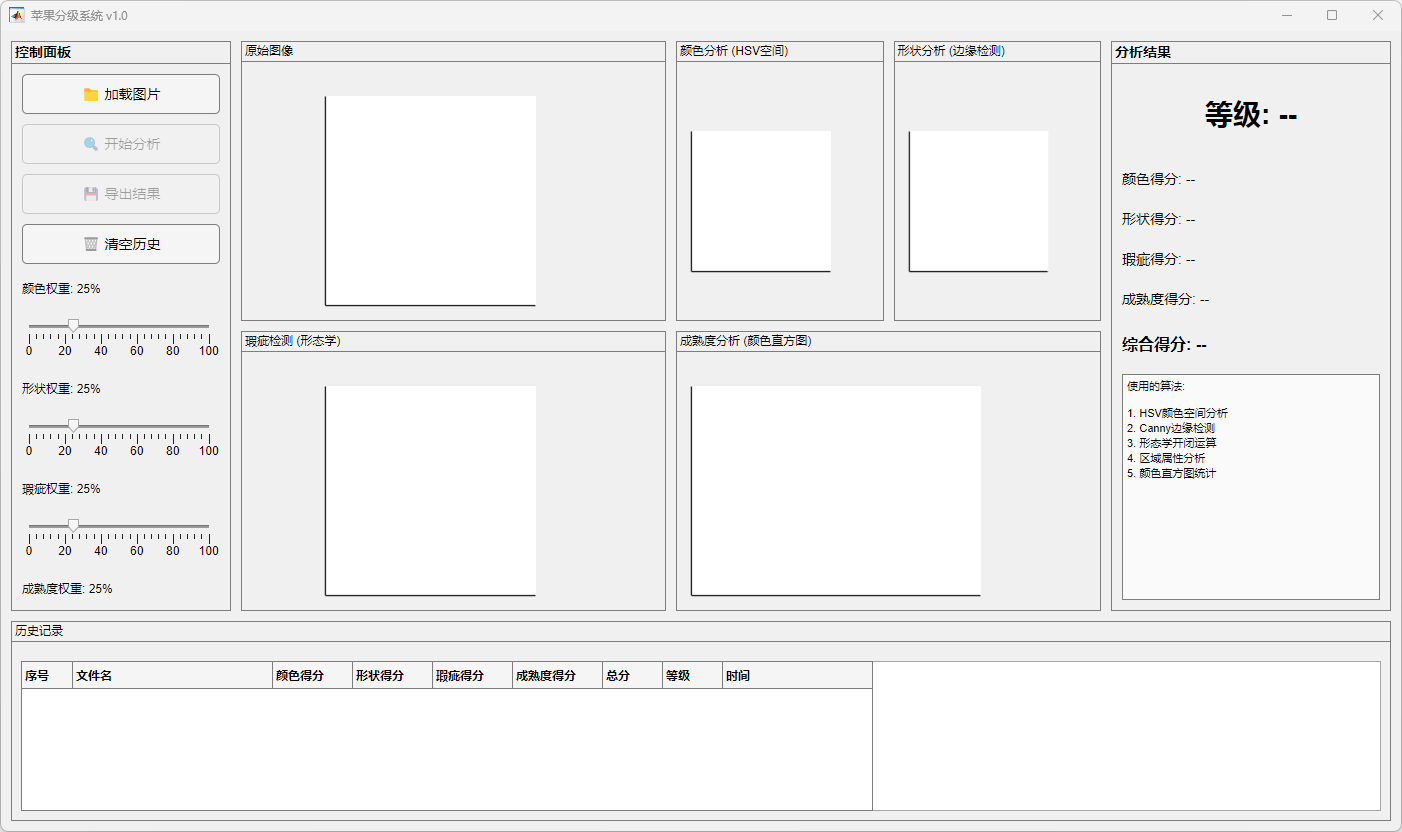 图 1 展示了苹果分级系统的主界面布局。界面采用模块化设计,左侧为控制面板,提供图像加载、分析启动、结果导出及历史记录清空等功能,并支持各特征权重的交互式调节;中间区域用于显示原始图像及颜色分析、形状分析、瑕疵检测和成熟度分析的可视化结果;右侧为分析结果区,实时显示各特征得分、综合得分及最终等级判定;底部为历史记录表,用于保存多次分析结果。整体界面结构清晰,便于用户操作与结果对比。