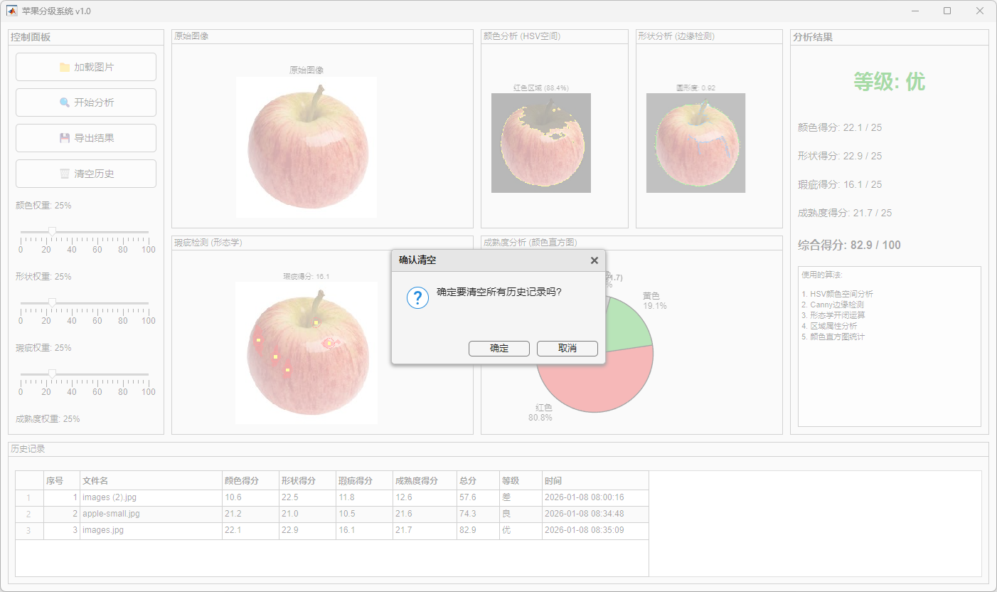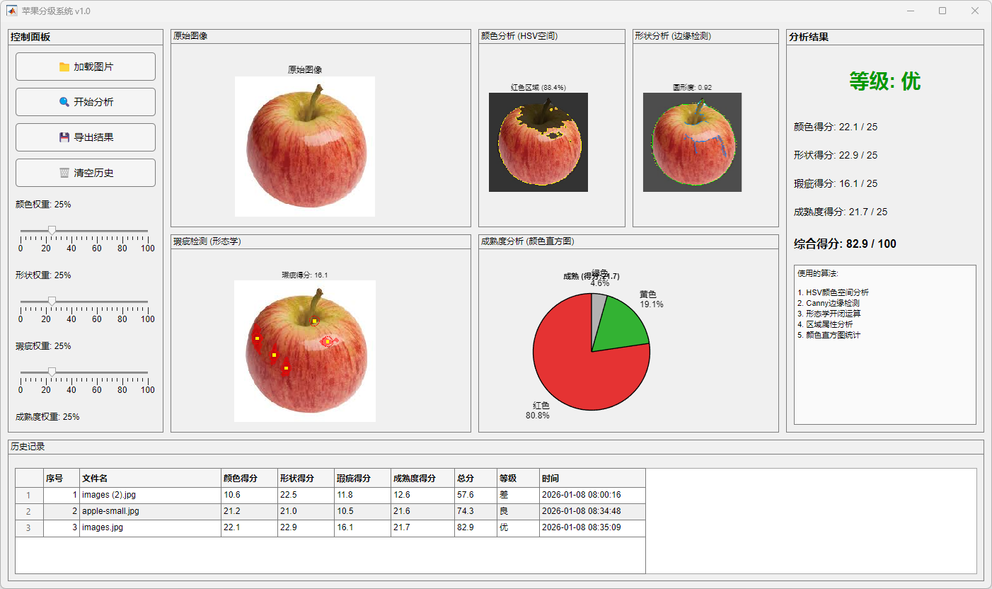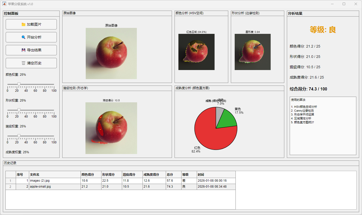 本文以 MATLAB 为开发平台,构建了一套完整的苹果品质自动分级系统。系统首先对输入苹果图像进行预处理,通过中值滤波抑制噪声并在 HSV 颜色空间下实现果实区域的有效分割。在此基础上,从颜色、形状、表面瑕疵及成熟度四个维度提取苹果外观特征。其中,颜色特征通过红色占比与上色均匀度进行表征,形状特征基于区域几何参数衡量果实规整性,瑕疵特征结合形态学操作与阈值分割方法进行检测,成熟度特征则融合 RGB 通道比例与饱和度信息进行综合评估。各特征模块得分经加权融合后,得到苹果的综合评分及品质等级。