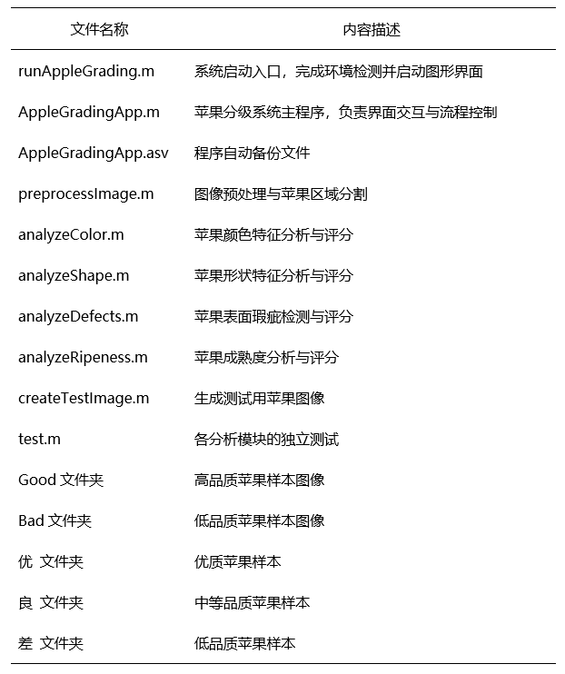 实验结果表明,所提出的苹果品质分级系统能够较为准确地反映苹果外观质量差异,对不同品质等级的苹果具有良好的区分能力。该方法具有实现过程清晰、可解释性强和工程实现性好的特点,可为苹果品质自动分级提供一种可行的技术方案。同时,研究结果也为后续引入机器学习等方法对分级模型进行优化提供了基础。