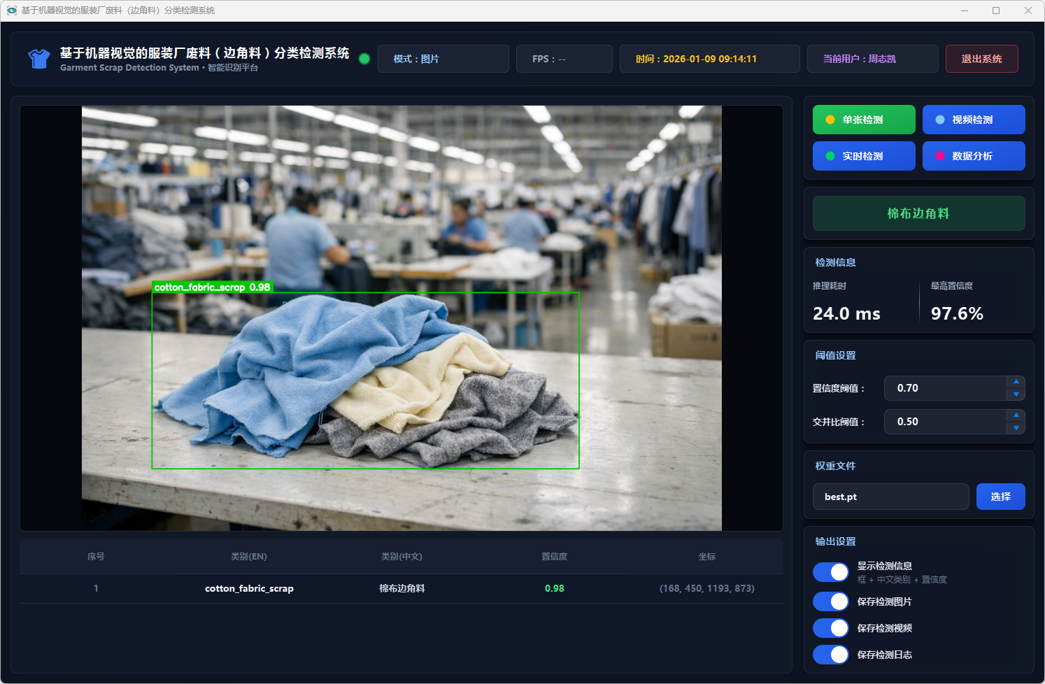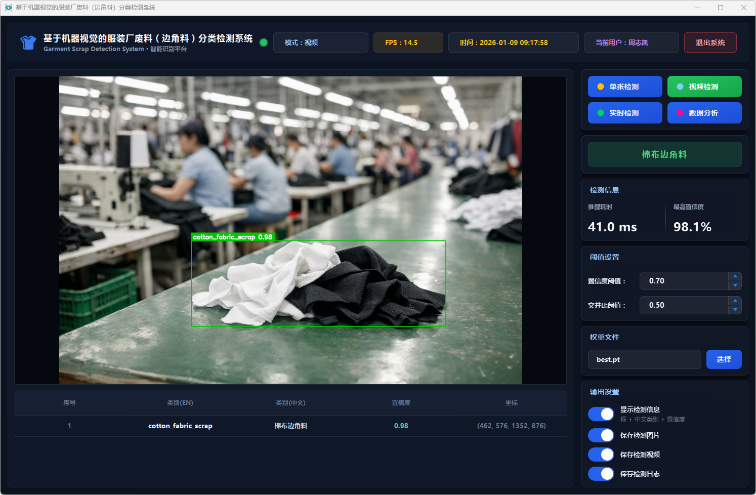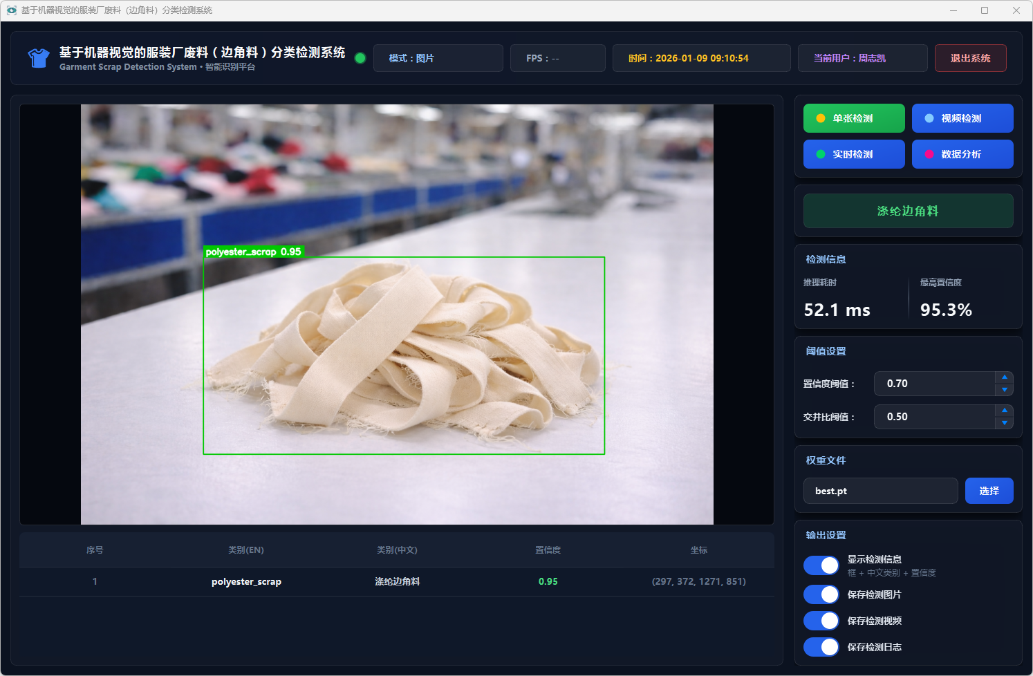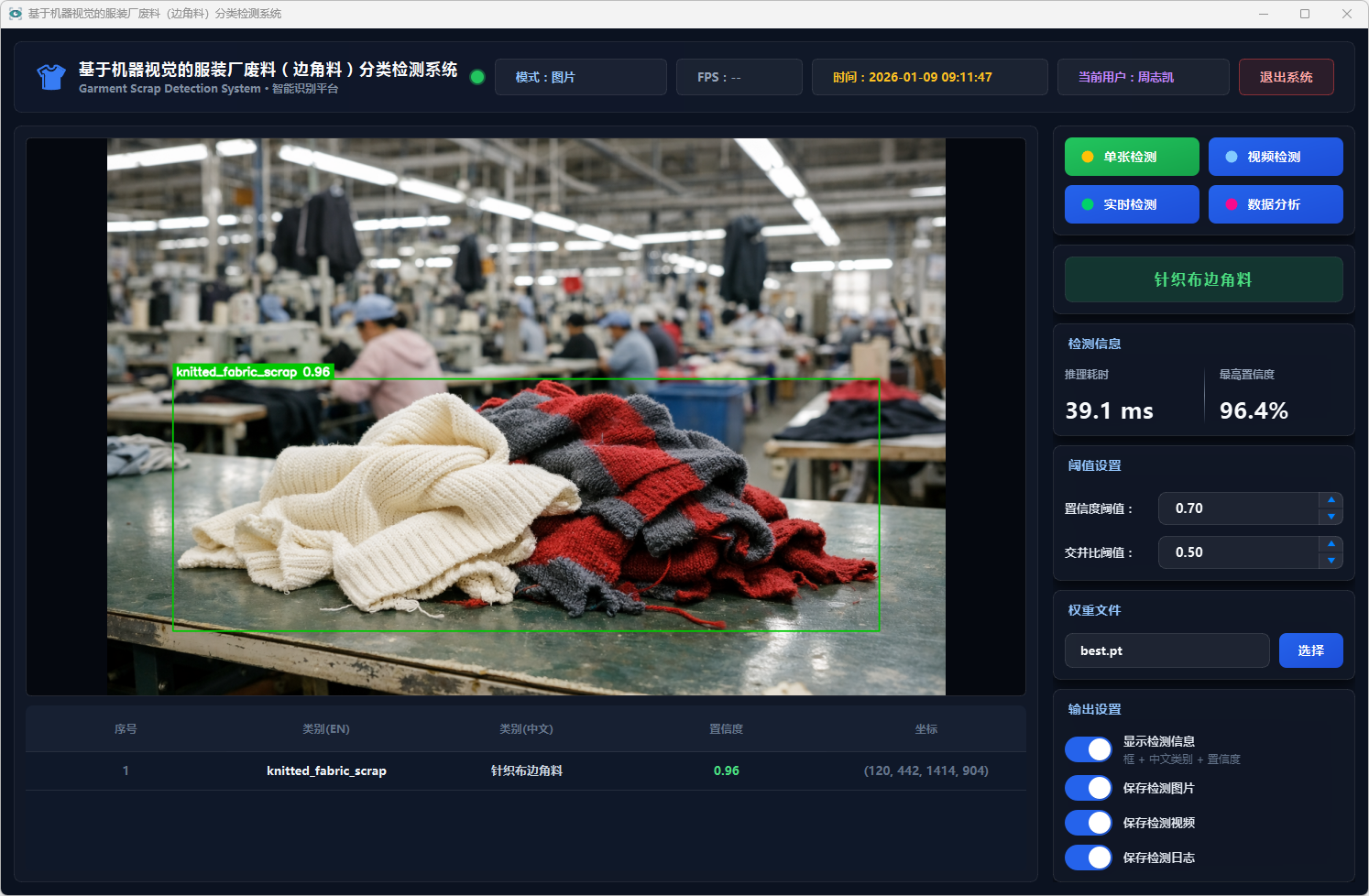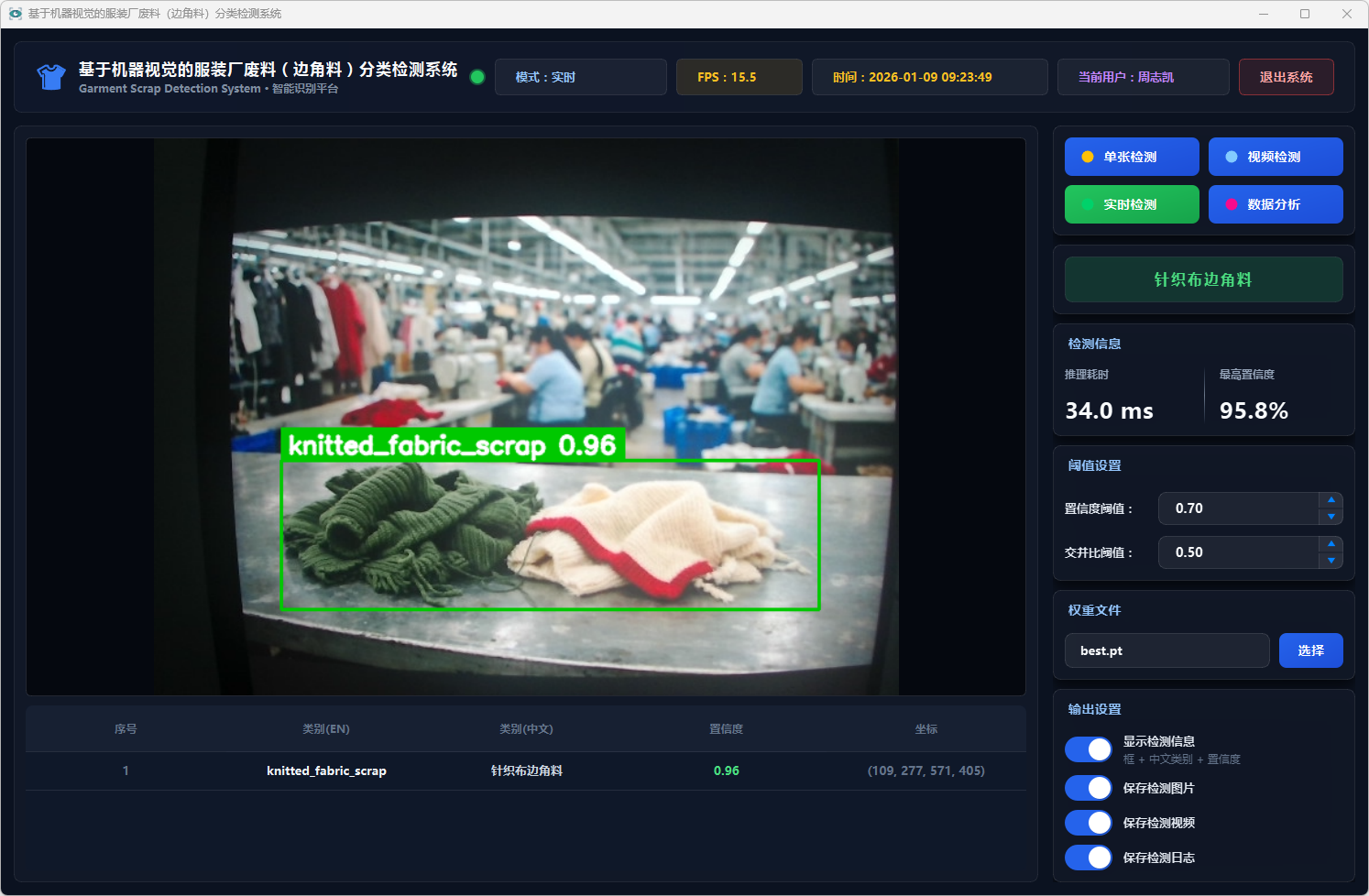 测试结果表明,该系统能够在复杂背景条件下稳定运行,具备较好的识别准确率与实时性,能够有效提升服装厂废料分类检测效率,具有一定的实际应用价值,可为服装厂废料智能分拣与回收处理提供技术支持。