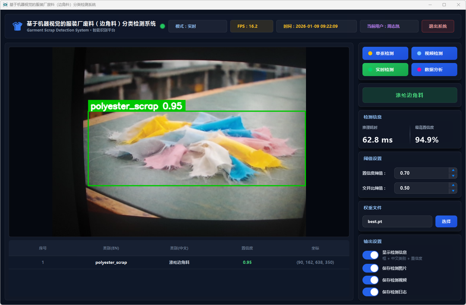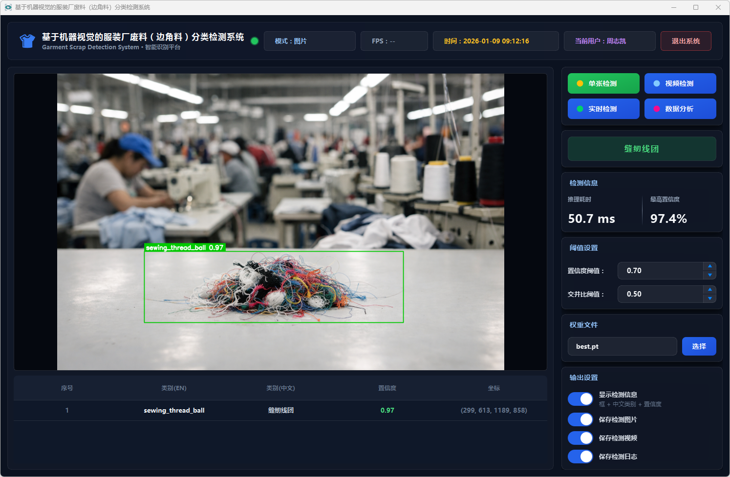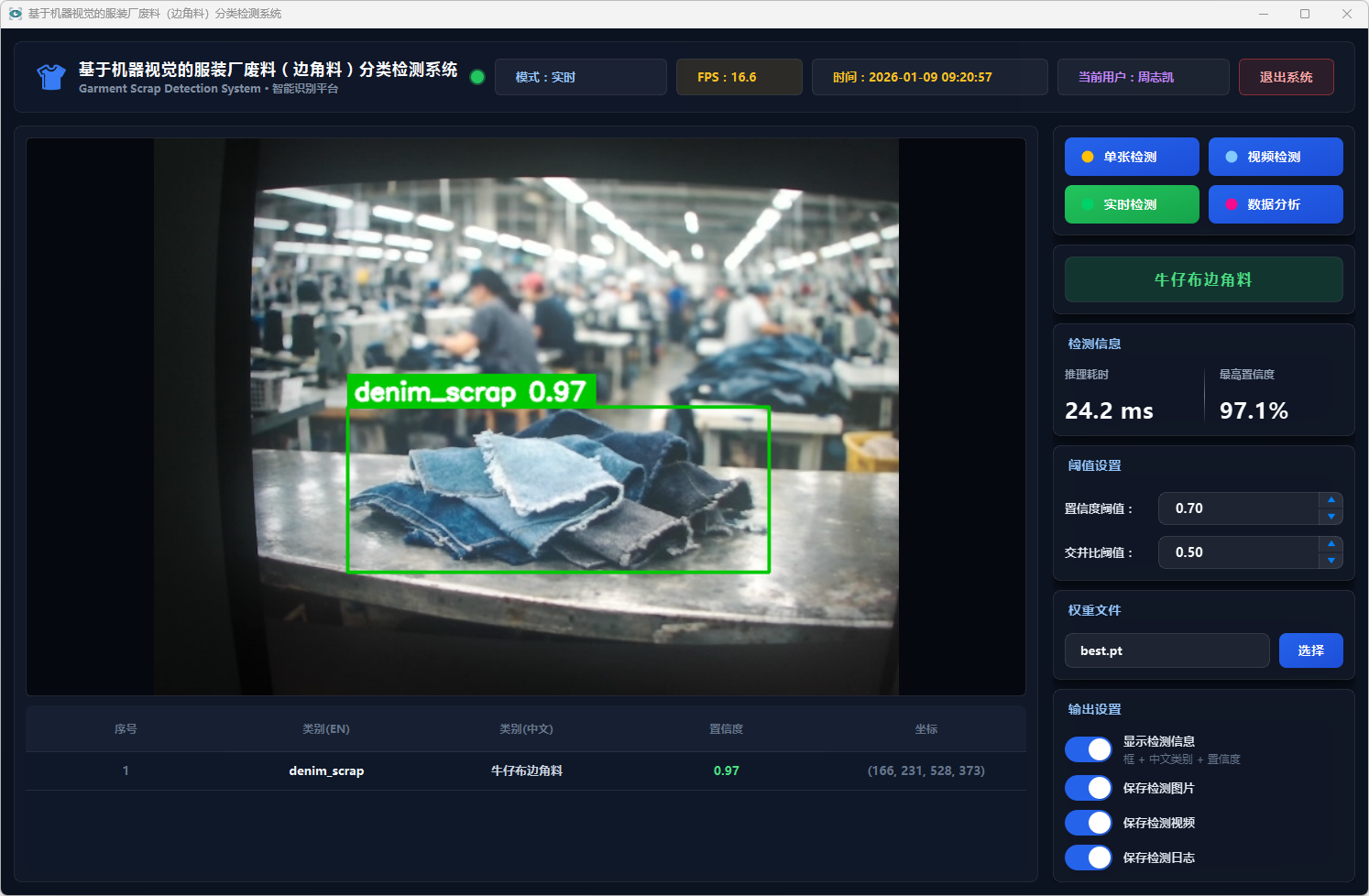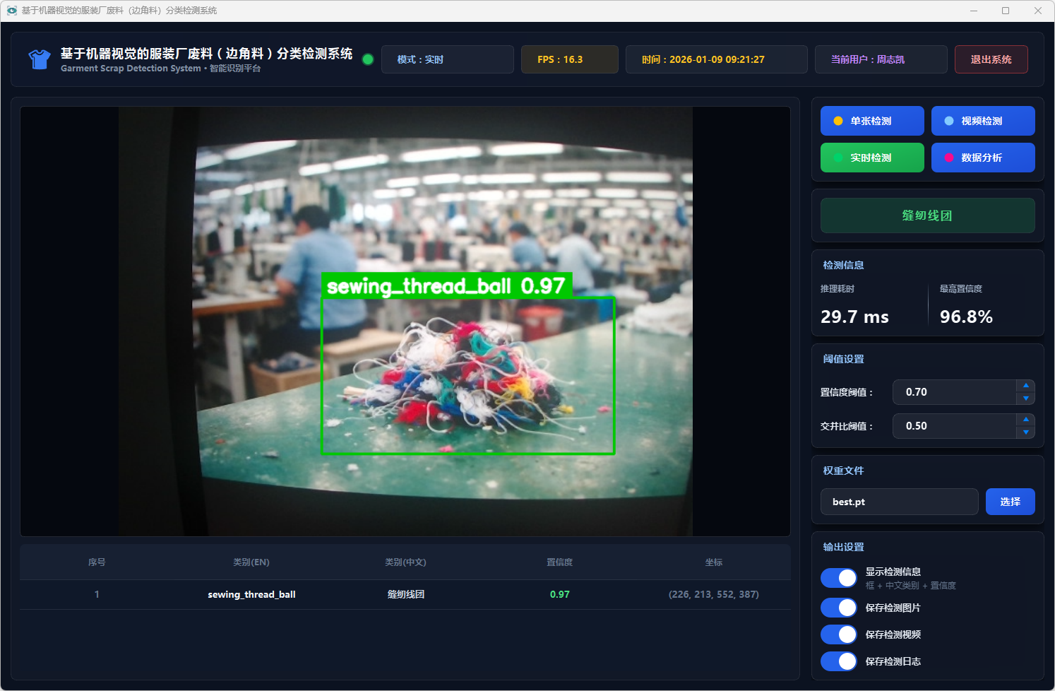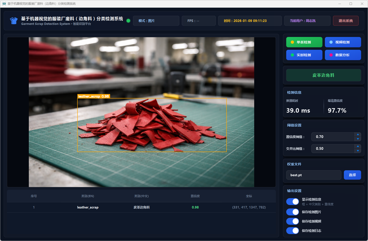 测试结果表明,该系统能够在复杂背景条件下稳定运行,具备较好的识别准确率与实时性,能够有效提升服装厂废料分类检测效率,具有一定的实际应用价值,可为服装厂废料智能分拣与回收处理提供技术支持。