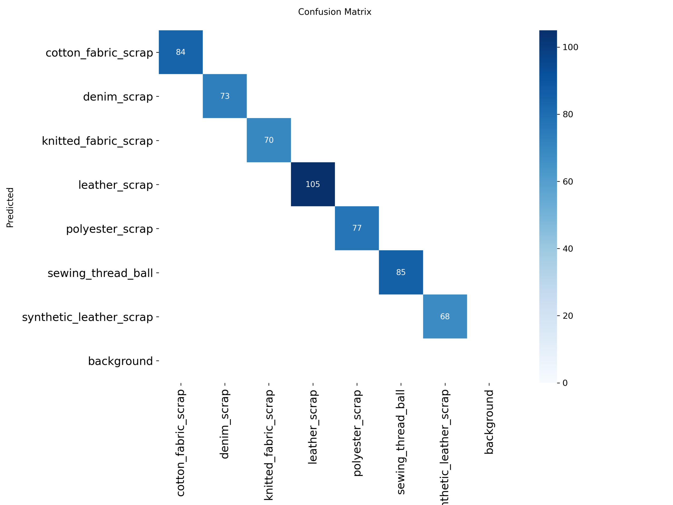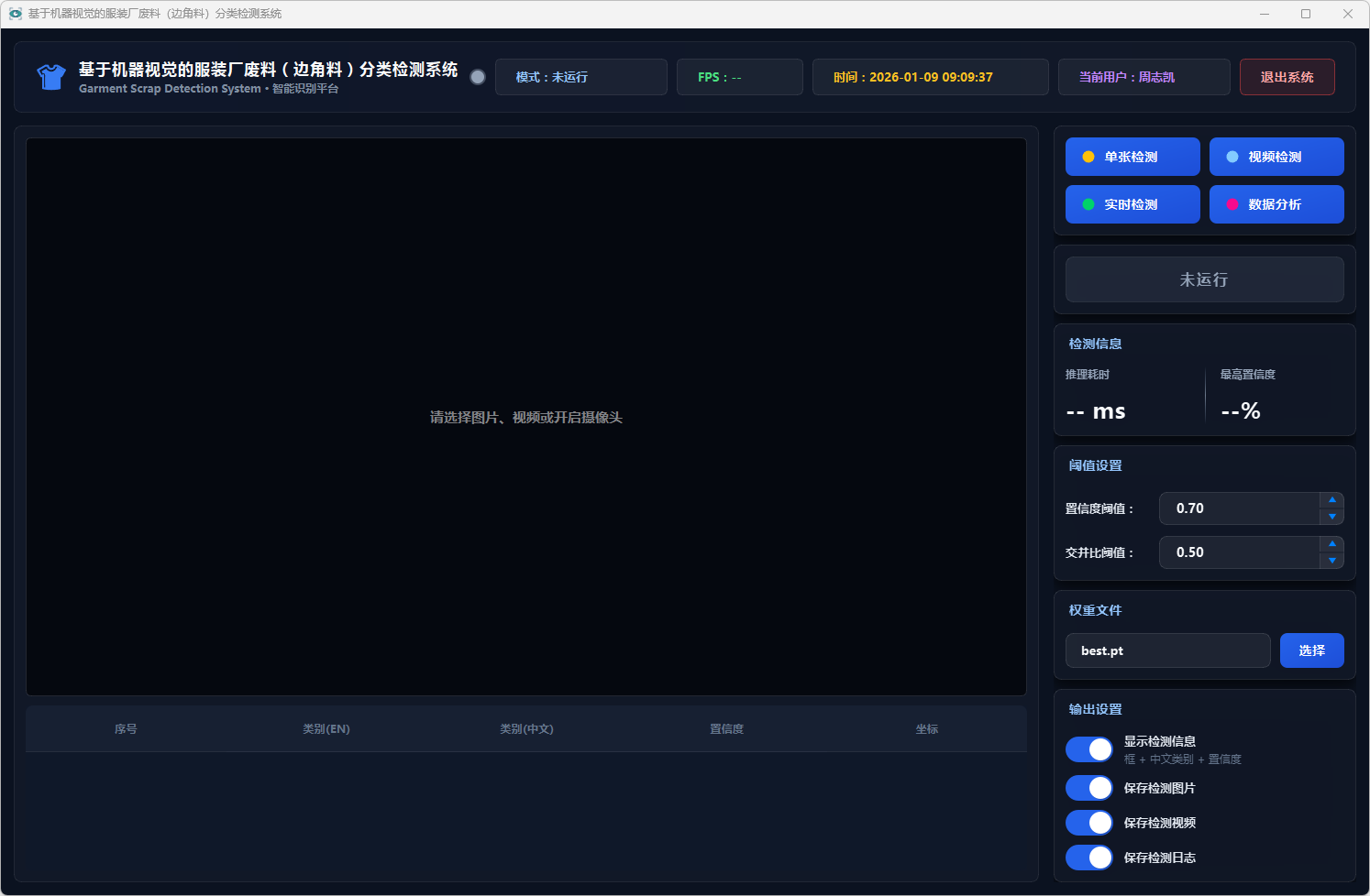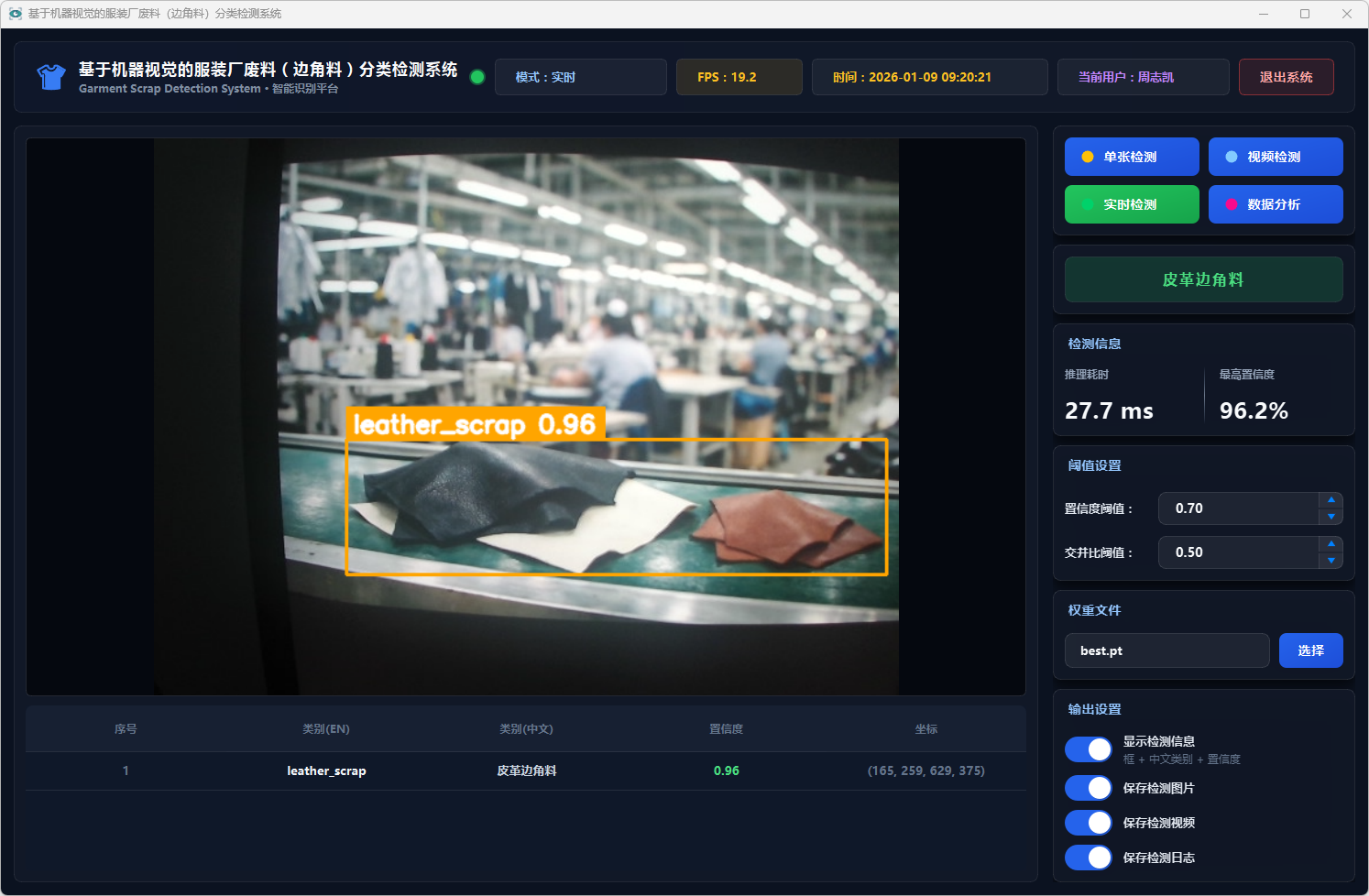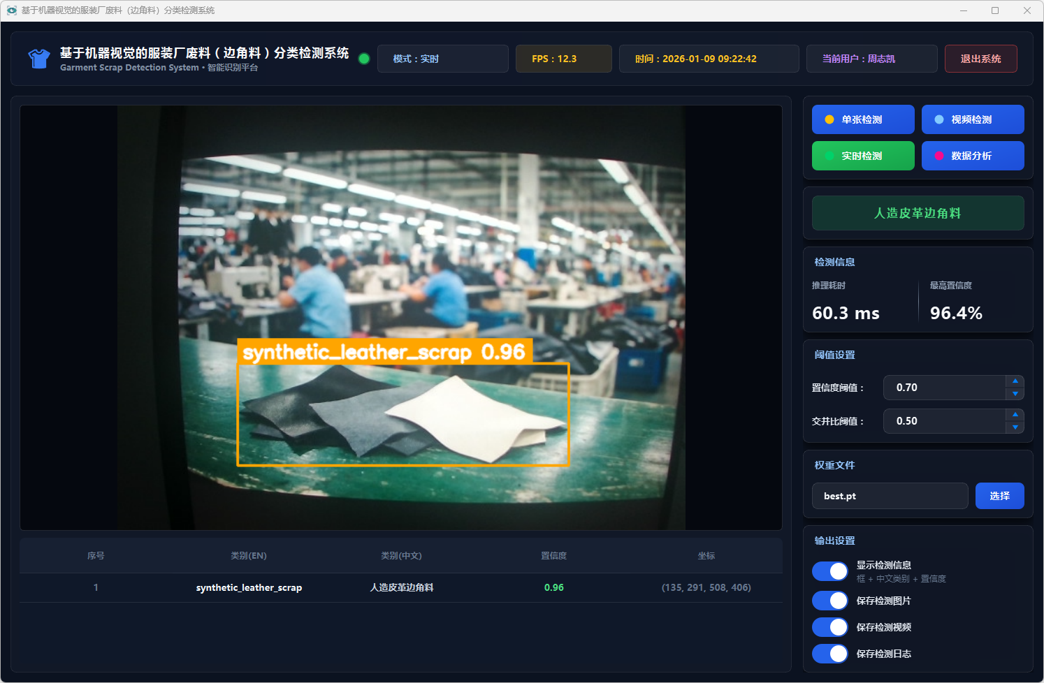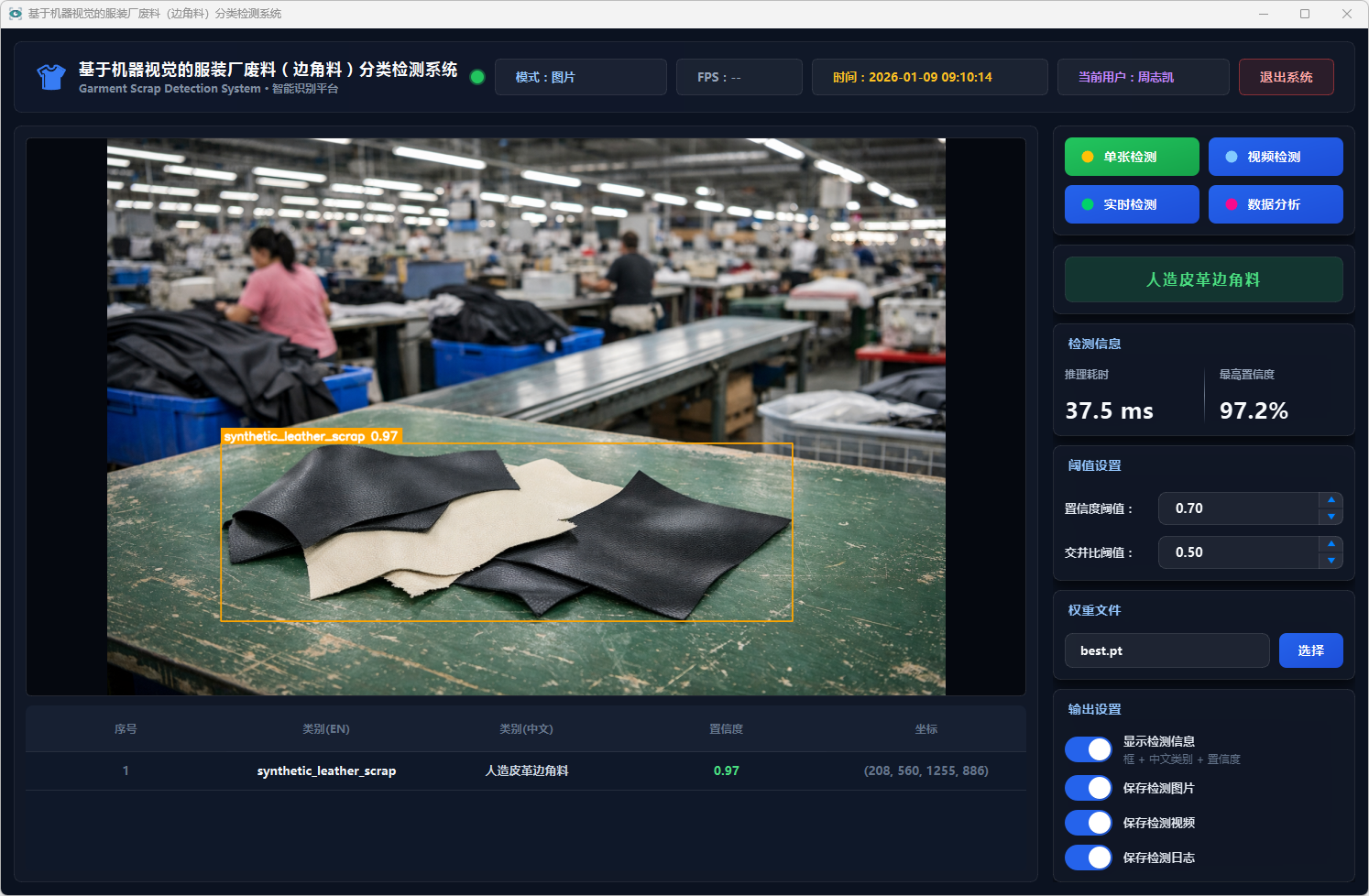 测试结果表明,该系统能够在复杂背景条件下稳定运行,具备较好的识别准确率与实时性,能够有效提升服装厂废料分类检测效率,具有一定的实际应用价值,可为服装厂废料智能分拣与回收处理提供技术支持。