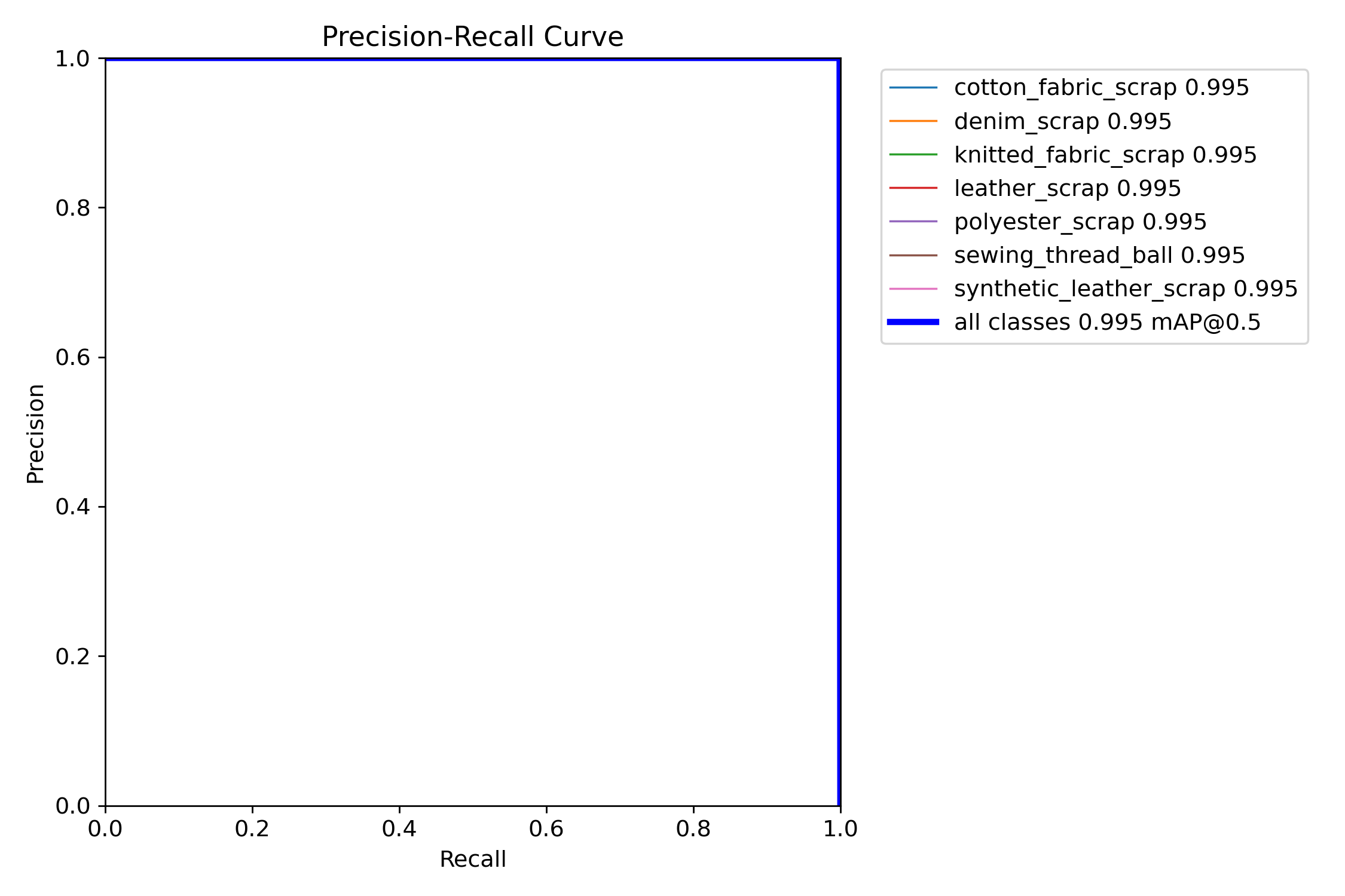 该 PR 曲线整体贴近右上角,各类别 AP 均约为 0.995、总体 mAP@0.5 达 0.995,说明模型在废料分类检测中同时具备极高的精确率与召回率、误检漏检极少。